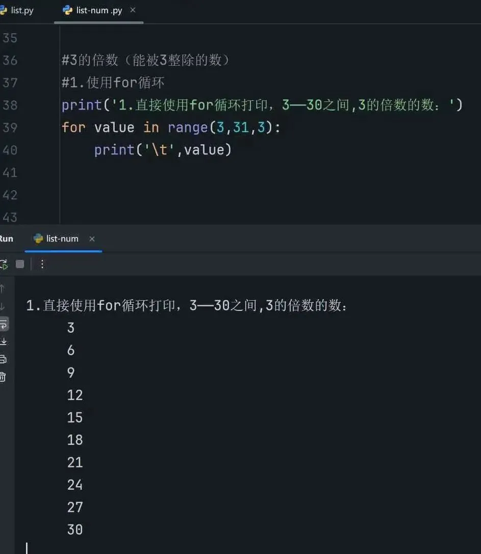 4.创建一个列表,其中包含3~30内能被3整除的数,再将这个列表打印出来