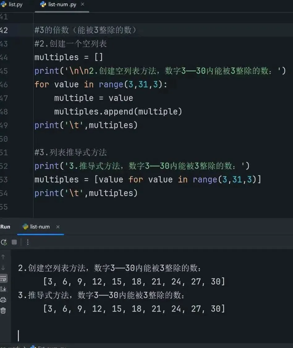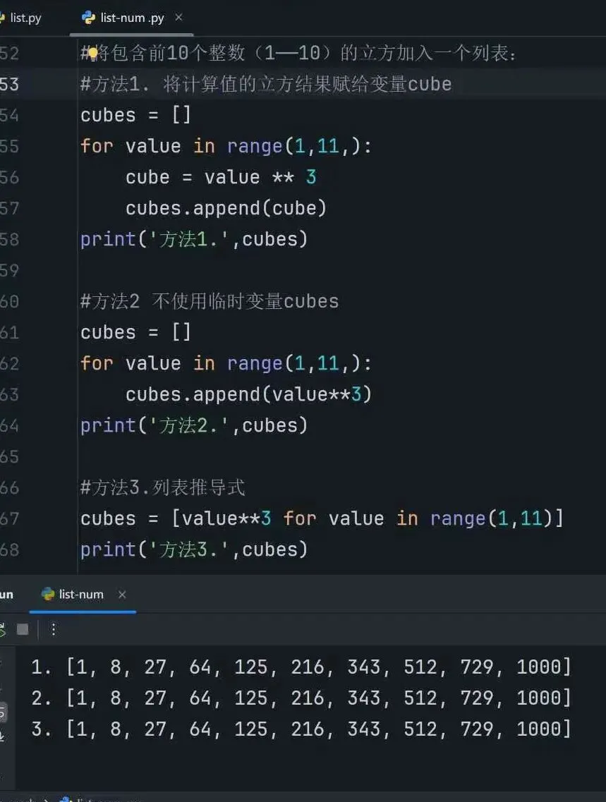7.列表推导式:生成列表的方式包含三四行代码,而列表推导式只需编写一行代码就能生成这样的列表。