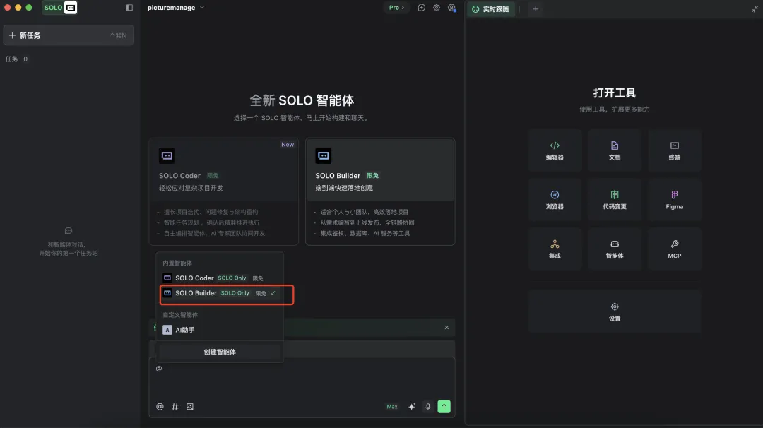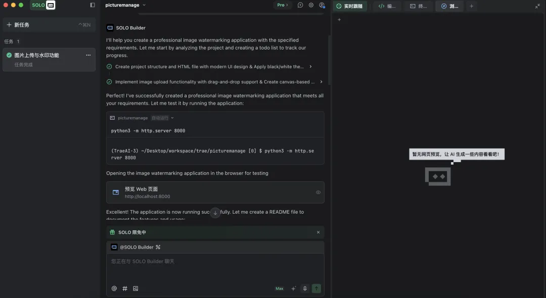 这个是纯前端项目,核心功能是给图片加水印,并支持下载。这次演示主要是使用 Trae 的 SOLO 模式。
