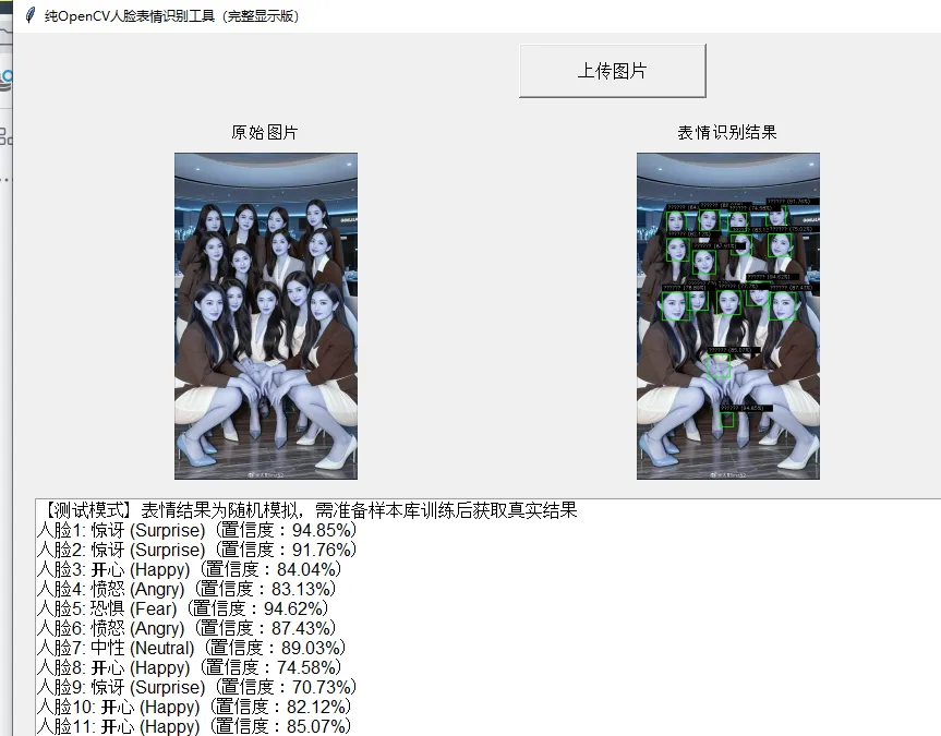 要结合 tkinter 实现图片上传交互,同时核心逻辑仅依赖 OpenCV、无其他第三方库,并且要做一个复杂度更高的人脸表情识别程序——舍弃深度学习框架,完全基于 OpenCV 原生的传统计算机视觉技术(HOG+SVM、LBPH 特征、多尺度人脸检测、形态学优化)来实现,同时保证程序的鲁棒性和功能完整性。