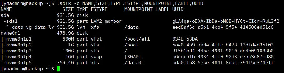[ymadmin@backup ~]$ lsblk -o NAME,SIZE,TYPE,FSTYPE,MOUNTPOINT,LABEL,UUID