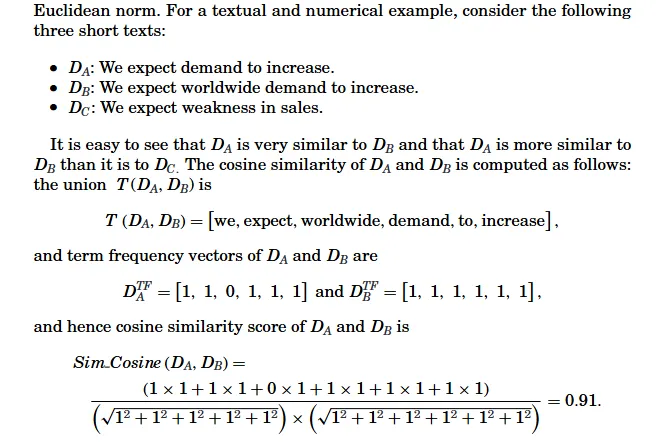 以此类推就能算出“一对文本”之间的相似度。但是需要注意,上面这篇文章取的是布尔向量,即只有 0 和 1 组成的向量。在实践过程中也可以使用简单词频或者 TF-IDF 等方法替换向量中的具体元素,可以参考:【NLP】从向量空间模型到词嵌入模型。