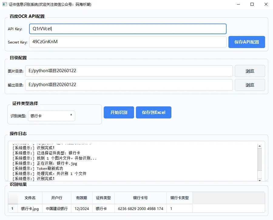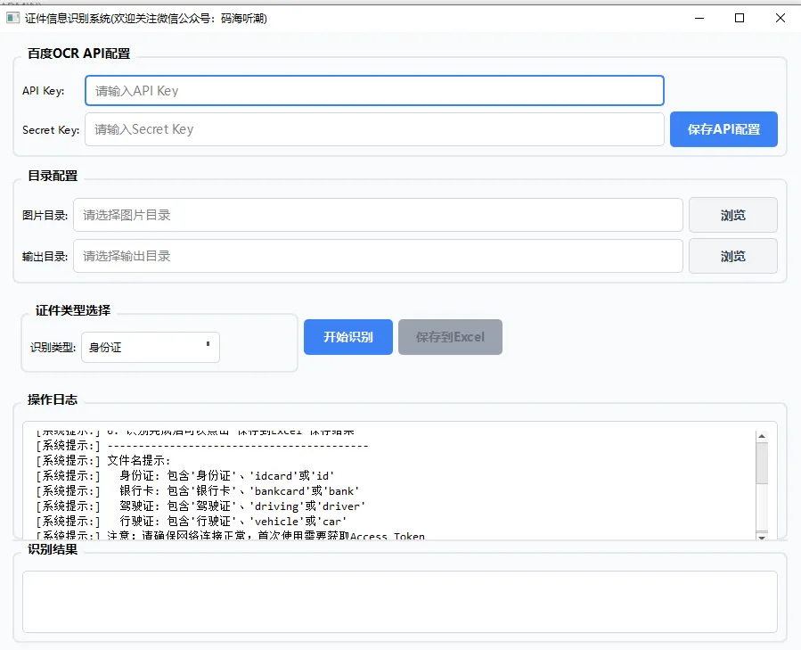 import osimport sysimport jsonfrom datetime import datetimefrom pathlib import Pathfrom typing import Dict, Listfrom PyQt6.QtWidgets import ( QApplication, QMainWindow, QWidget, QVBoxLayout, QHBoxLayout, QLabel, QLineEdit, QPushButton, QComboBox, QTextEdit, QGroupBox, QGridLayout, QFileDialog, QMessageBox, QFrame, QProgressBar, QTableWidget, QTableWidgetItem, QHeaderView, QSplitter)from PyQt6.QtCore import Qtfrom PyQt6.QtGui import QFont, QPalette, QColor, QTextCursor# 初始API配置DEFAULT_CONFIG = { "api_key": "", "secret_key": "", "image_dir_path": "", "output_dir_path": "", "selected_ocr_type": "idcard"}class StyledLineEdit(QLineEdit): """自定义样式输入框""" def __init__(self, placeholder="", parent=None): super().__init__(parent) self.setPlaceholderText(placeholder) self.setMinimumHeight(35) self.setStyleSheet(""" QLineEdit { border: 1px solid #d1d5db; border-radius: 5px; padding: 8px; background-color: white; font-size: 14px; } QLineEdit:focus { border: 2px solid #3b82f6; } QLineEdit:hover { border: 1px solid #9ca3af; } """)class StyledButton(QPushButton): """自定义样式按钮""" def __init__(self, text="", primary=False, parent=None): super().__init__(text, parent) self.setMinimumHeight(40) self.setMinimumWidth(100) self.setCursor(Qt.CursorShape.PointingHandCursor) if primary: self.setStyleSheet(""" QPushButton { background-color: #3b82f6; color: white; border: none; border-radius: 5px; padding: 10px 20px; font-weight: bold; font-size: 14px; } QPushButton:hover { background-color: #2563eb; } QPushButton:pressed { background-color: #1d4ed8; } QPushButton:disabled { background-color: #9ca3af; color: #6b7280; } """) else: self.setStyleSheet(""" QPushButton { background-color: #f3f4f6; color: #374151; border: 1px solid #d1d5db; border-radius: 5px; padding: 10px 20px; font-weight: bold; font-size: 14px; } QPushButton:hover { background-color: #e5e7eb; border-color: #9ca3af; } QPushButton:pressed { background-color: #d1d5db; } QPushButton:disabled { background-color: #f3f4f6; color: #9ca3af; border-color: #e5e7eb; } """)class StyledTextEdit(QTextEdit): """自定义样式文本编辑框""" def __init__(self, parent=None): super().__init__(parent) self.setReadOnly(True) self.setMinimumHeight(150) self.setStyleSheet(""" QTextEdit { border: 1px solid #d1d5db; border-radius: 5px; padding: 10px; background-color: white; font-family: 'Consolas', 'Monaco', monospace; font-size: 13px; } QTextEdit:focus { border: 2px solid #3b82f6; } """)class OCRMainWindow(QMainWindow): """主窗口""" def __init__(self): super().__init__() self.config_file = "ocr_config.json" self.config = DEFAULT_CONFIG.copy() self.all_results = {} self.setup_ui() self.load_config() self.setup_styles() self.show_initial_tips() def setup_ui(self): """设置界面""" self.setWindowTitle("证件信息识别系统(欢迎关注微信公众号:码海听潮)") self.setGeometry(100, 100, 900, 700) self.setMinimumSize(800, 600) # 中央部件 central_widget = QWidget() self.setCentralWidget(central_widget) # 主布局 main_layout = QVBoxLayout(central_widget) main_layout.setContentsMargins(15, 15, 15, 15) main_layout.setSpacing(12) # API配置区域 api_group = QGroupBox("百度OCR API配置") api_group.setStyleSheet(""" QGroupBox { font-weight: bold; font-size: 14px; border: 2px solid #e2e8f0; border-radius: 8px; margin-top: 12px; padding-top: 10px; } QGroupBox::title { subcontrol-origin: margin; left: 10px; padding: 0 5px 0 5px; } """) api_layout = QGridLayout(api_group) self.api_key_edit = StyledLineEdit("请输入API Key") self.api_key_edit.setText(self.config["api_key"]) api_layout.addWidget(QLabel("API Key:"), 0, 0) api_layout.addWidget(self.api_key_edit, 0, 1) self.secret_key_edit = StyledLineEdit("请输入Secret Key") self.secret_key_edit.setText(self.config["secret_key"]) api_layout.addWidget(QLabel("Secret Key:"), 1, 0) api_layout.addWidget(self.secret_key_edit, 1, 1) self.save_api_btn = StyledButton("保存API配置", primary=True) self.save_api_btn.clicked.connect(self.save_api_config) api_layout.addWidget(self.save_api_btn, 1, 2) main_layout.addWidget(api_group) # 目录配置区域 dir_group = QGroupBox("目录配置") dir_group.setStyleSheet(api_group.styleSheet()) dir_layout = QGridLayout(dir_group) self.image_dir_edit = StyledLineEdit("请选择图片目录") self.image_dir_edit.setText(self.config["image_dir_path"]) dir_layout.addWidget(QLabel("图片目录:"), 0, 0) dir_layout.addWidget(self.image_dir_edit, 0, 1) self.browse_image_btn = StyledButton("浏览") self.browse_image_btn.clicked.connect(self.browse_image_dir) dir_layout.addWidget(self.browse_image_btn, 0, 2) self.output_dir_edit = StyledLineEdit("请选择输出目录") self.output_dir_edit.setText(self.config["output_dir_path"]) dir_layout.addWidget(QLabel("输出目录:"), 1, 0) dir_layout.addWidget(self.output_dir_edit, 1, 1) self.browse_output_btn = StyledButton("浏览") self.browse_output_btn.clicked.connect(self.browse_output_dir) dir_layout.addWidget(self.browse_output_btn, 1, 2) main_layout.addWidget(dir_group) # 证件类型和操作区域 control_frame = QFrame() control_layout = QHBoxLayout(control_frame) type_group = QGroupBox("证件类型选择") type_group.setStyleSheet(api_group.styleSheet()) type_layout = QHBoxLayout(type_group) type_layout.addWidget(QLabel("识别类型:")) self.type_combo = QComboBox() self.type_combo.addItems(["身份证", "银行卡", "驾驶证", "行驶证"]) self.type_combo.setCurrentText(self.get_ocr_type_name(self.config["selected_ocr_type"])) self.type_combo.currentTextChanged.connect(self.update_ocr_type_config) self.type_combo.setMinimumHeight(35) self.type_combo.setStyleSheet(""" QComboBox { border: 1px solid #d1d5db; border-radius: 5px; padding: 8px; background-color: white; min-width: 120px; } QComboBox:hover { border-color: #9ca3af; } QComboBox::drop-down { border: none; } QComboBox::down-arrow { image: none; border-left: 5px solid transparent; border-right: 5px solid transparent; border-top: 