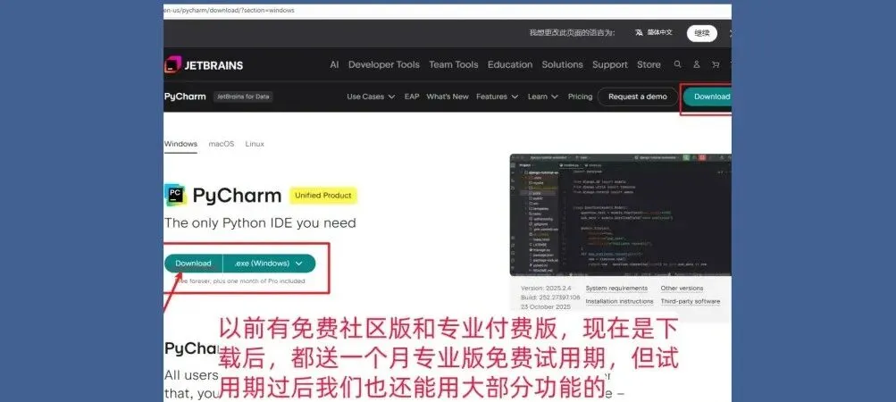 2.现在已经没区分社区版和专业版(之前有),在中间那里直接点击下载即可