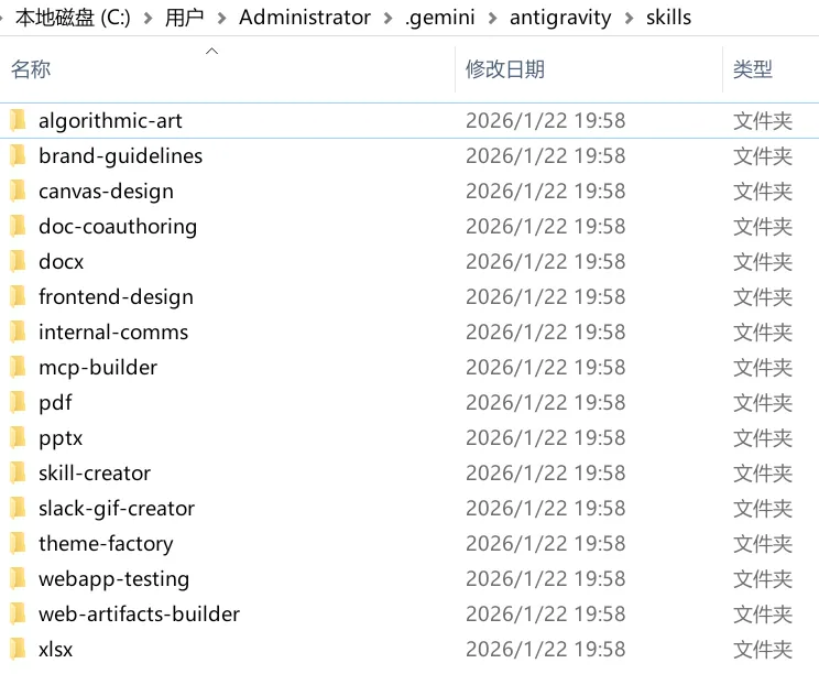 我使用的Windows系统,存放目录是 C:\Users\Administrator.gemini\antigravity\skills