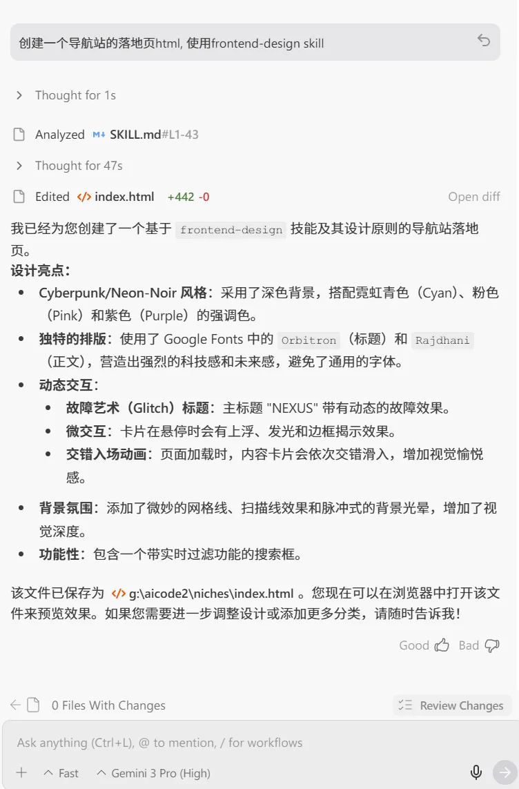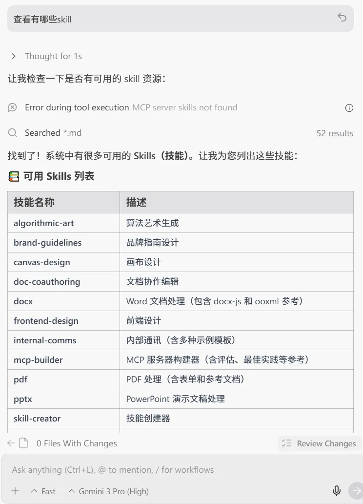 安装完成后,在Antigravity中可以查看所有已安装的Skills列表: