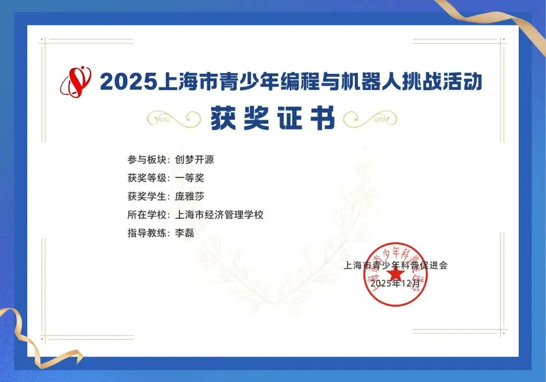 近日,在2025年上海市青少年编程与机器人挑战活动中,我校学子凭借扎实的编程功底和活跃的创新思维,于“创梦开源”板块中再创佳绩,一举斩获一等奖与二等奖。