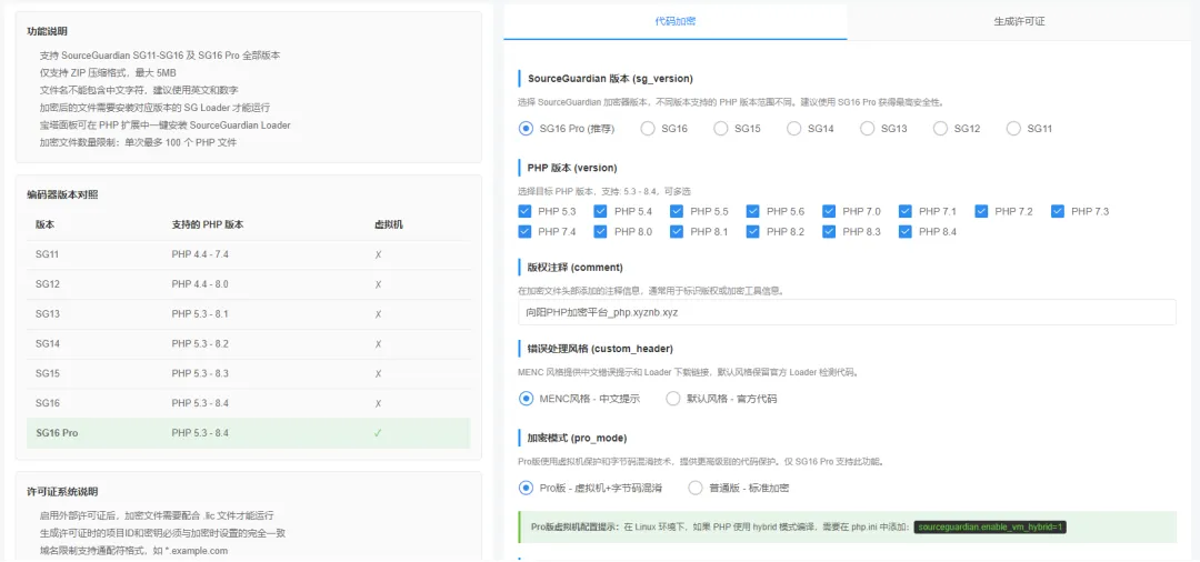 高端付费加密引擎(SourceGuardian 全系 /ionCube 全系)均支持自定义生成专属授权许可证,可根据业务需求灵活配置: