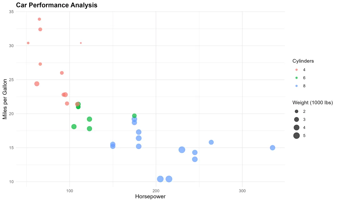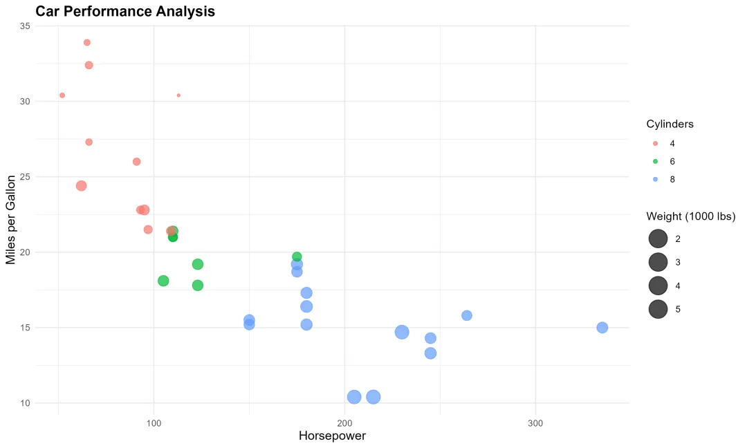 # 我们来看看不同气缸数的车,马力、油耗和重量的关系