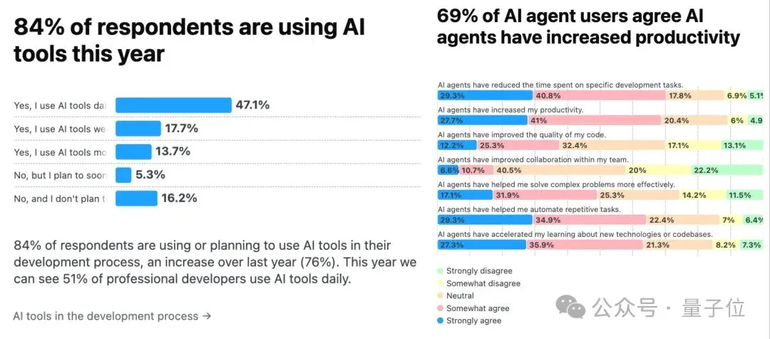 Stack Overflow年度报告显示有84%的开发者在工作过程中会使用AI工具,69%的人认为使用AI工具提高了生产力。