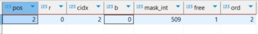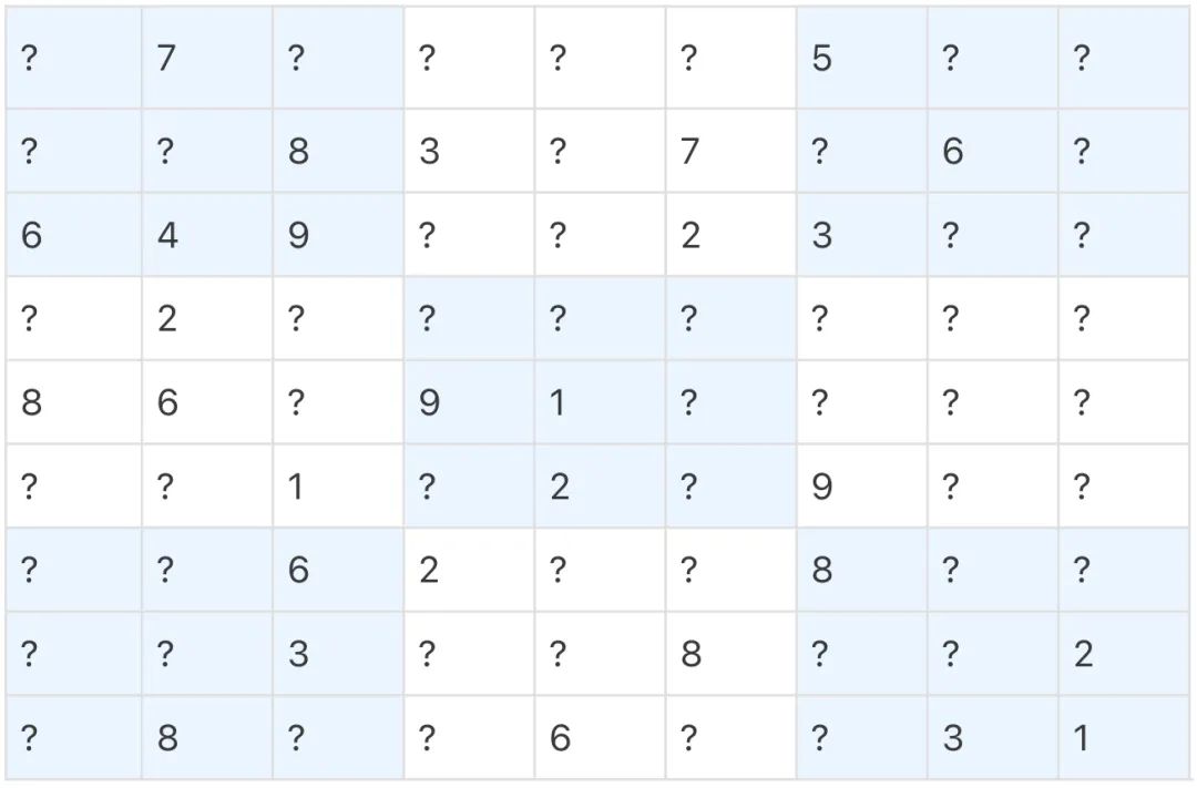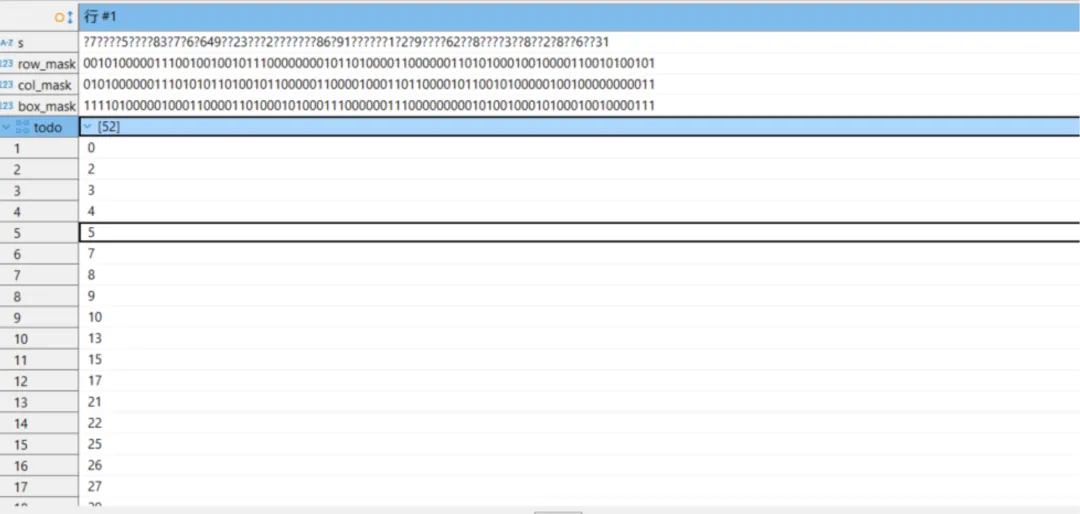 -- 行/列/宫掩码:每 9bit 表示一行/列/宫已用数字row_mask AS (SELECT coalesce(bit_or(set_bit(B'0'::bit(81), (pos/9)*9 + (8 - (ch::int - 1)), 1)),B'0'::bit(81)) AS maskFROM cellsWHERE ch <> '?'),col_mask AS (SELECT coalesce(bit_or(set_bit(B'0'::bit(81), (pos%9)*9 + (8 - (ch::int - 1)), 1)),B'0'::bit(81)) AS maskFROM cellsWHERE ch <> '?'),box_mask AS (SELECT coalesce(bit_or(set_bit(B'0'::bit(81), ((((pos/9)/3)*3 + ((pos%9)/3))*9) + (8 - (ch::int - 1)), 1)),B'0'::bit(81)) AS maskFROM cellsWHERE ch <> '?'),-- todo:记录所有待填位置todo AS (SELECT coalesce(array_agg(pos ORDER BY pos), ARRAY[]::int[]) AS arrFROM cellsWHERE ch = '?'),seed AS (SELECT clean.s,row_mask.mask AS row_mask,col_mask.mask AS col_mask,box_mask.mask AS box_mask,todo.arr AS todoFROM clean, row_mask, col_mask, box_mask, todo),