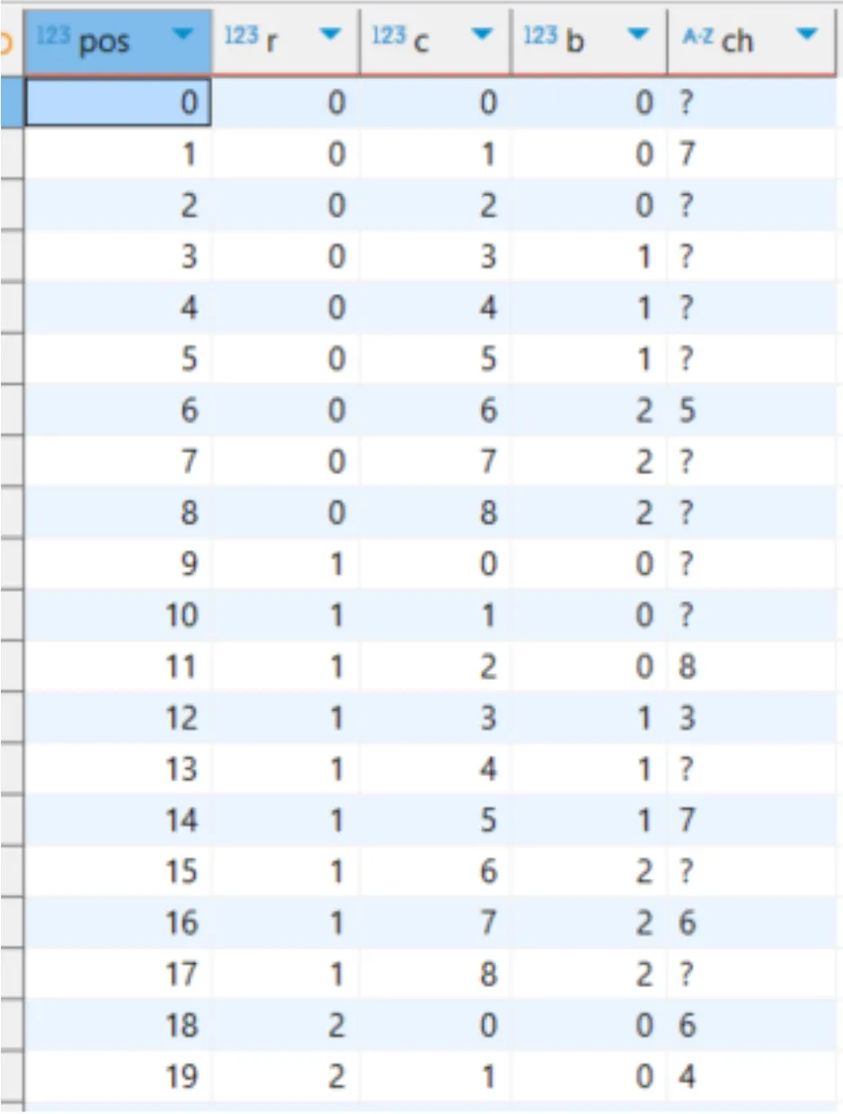 将 81 个字符的字符串展开成 81 行数据,并计算好每个格子所属的 r(行)、c(列)、b(宫)坐标。这是为了初始化掩码做准备。