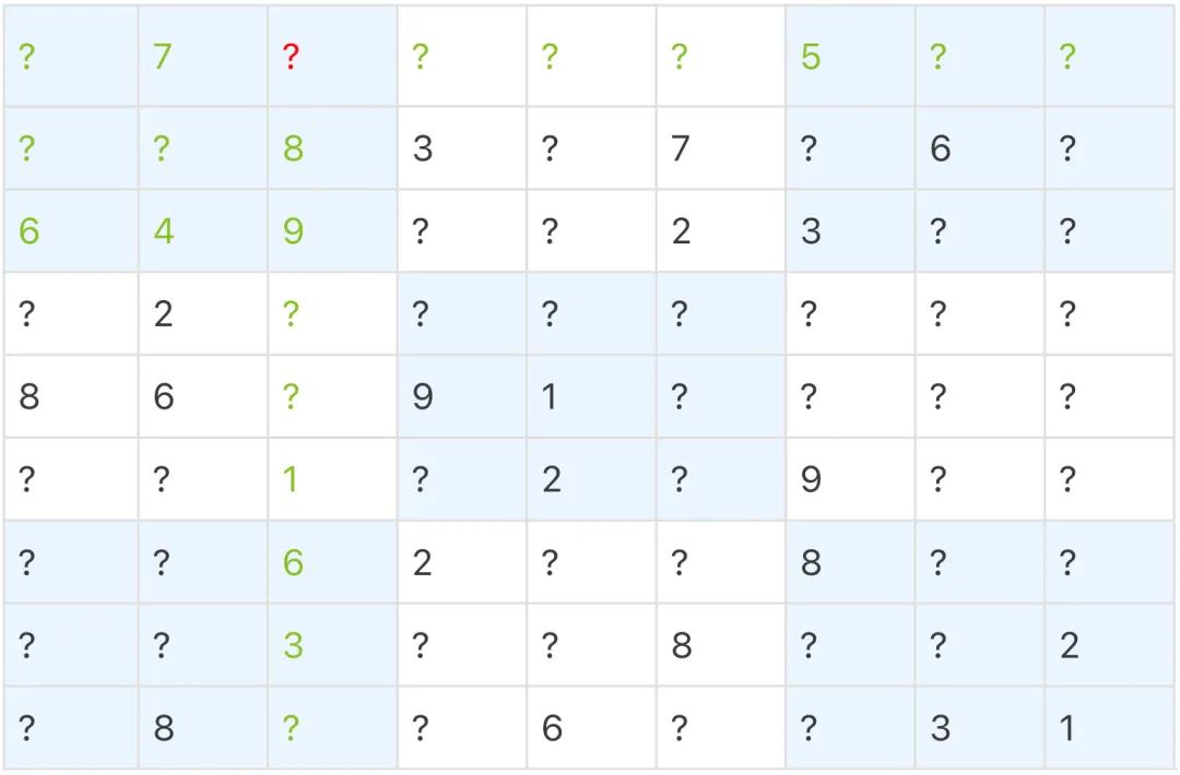 如果一个格子只剩 1 个能填的数(自由度=1),立刻填它。