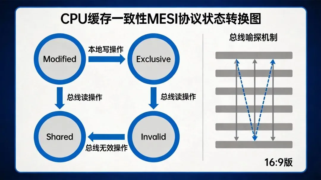 MESI协议(Modified-Exclusive-Shared-Invalid)是目前最经典的基于总线嗅探(Snooping)的缓存一致性协议。其名称来源于缓存行的四种状态: