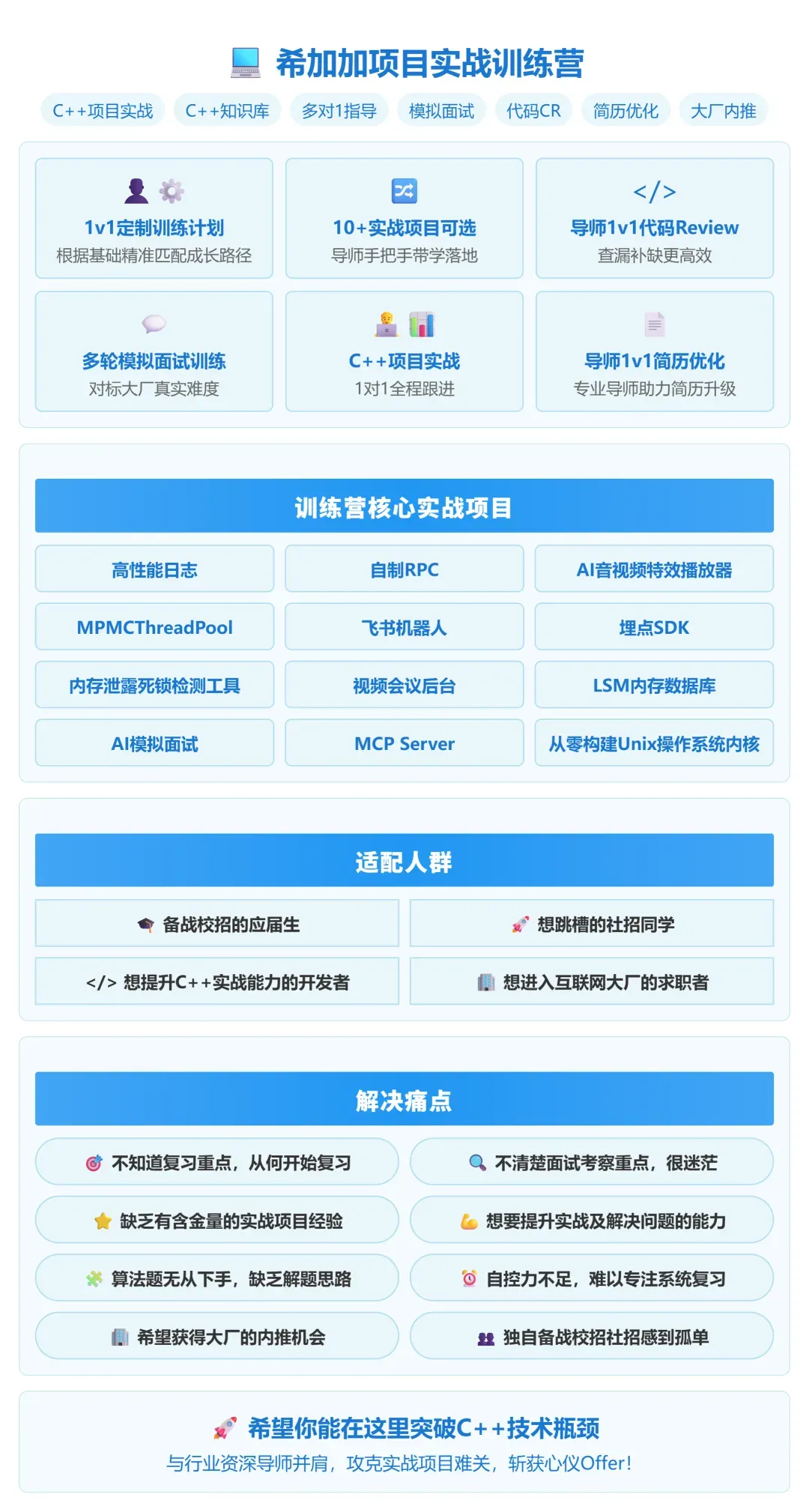 如果你的目标是把技术水平拉起来,也想在简历上增加一些真正能说得出口的内容,可以趁这段时间做几个C++ 实战项目。既能把底层功底练扎实,也能让春招、考研复试、社招面试里遇到的技术问题更从容,有需要的朋友可以移步文末查看训练营相关介绍。