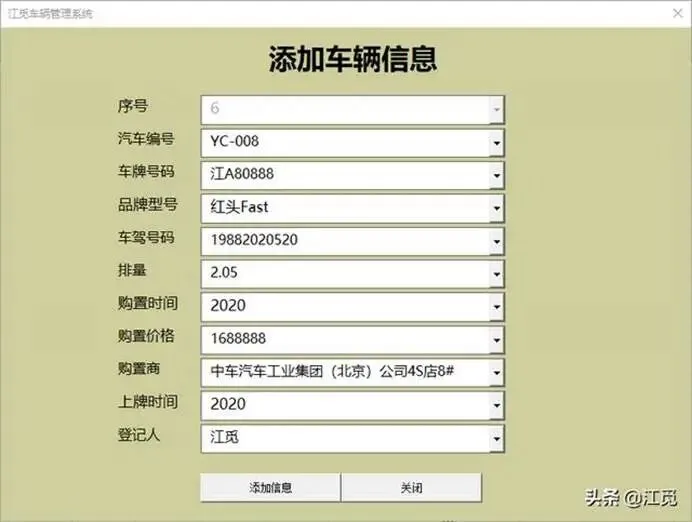 基于系统设置表,优先开发车辆信息添加功能。界面设计遵循“先功能后美观”原则,初期颜色搭配简单,后续可通过设置表自定义优化。页面包含序号、汽车编号、车牌号码、品牌型号、车架号码、排量、购置信息等字段,兼顾实用性与易用性。