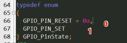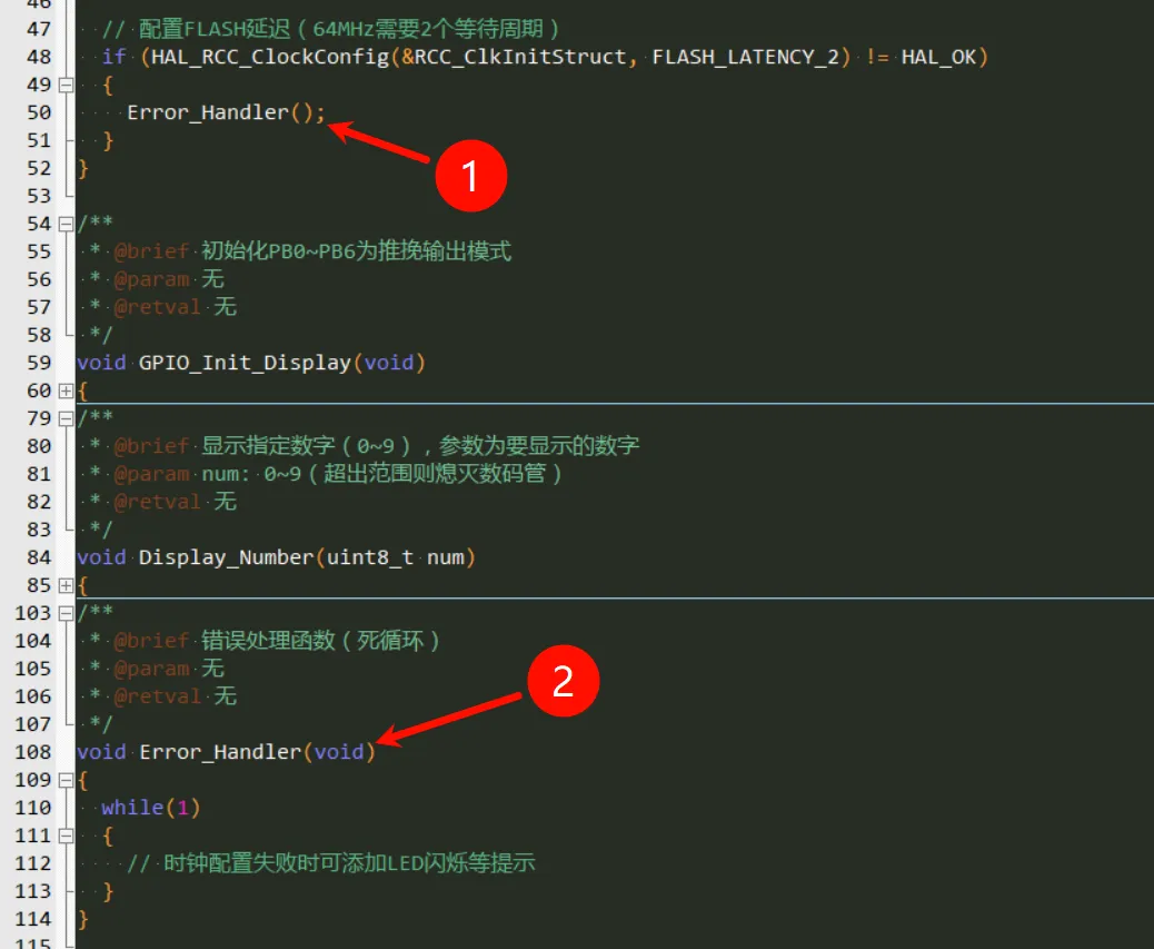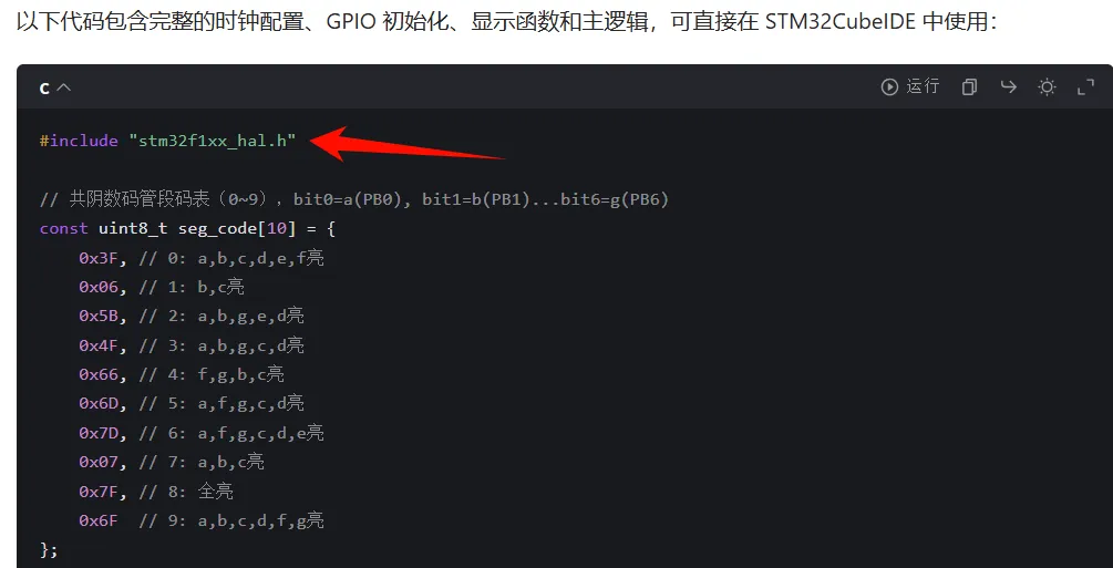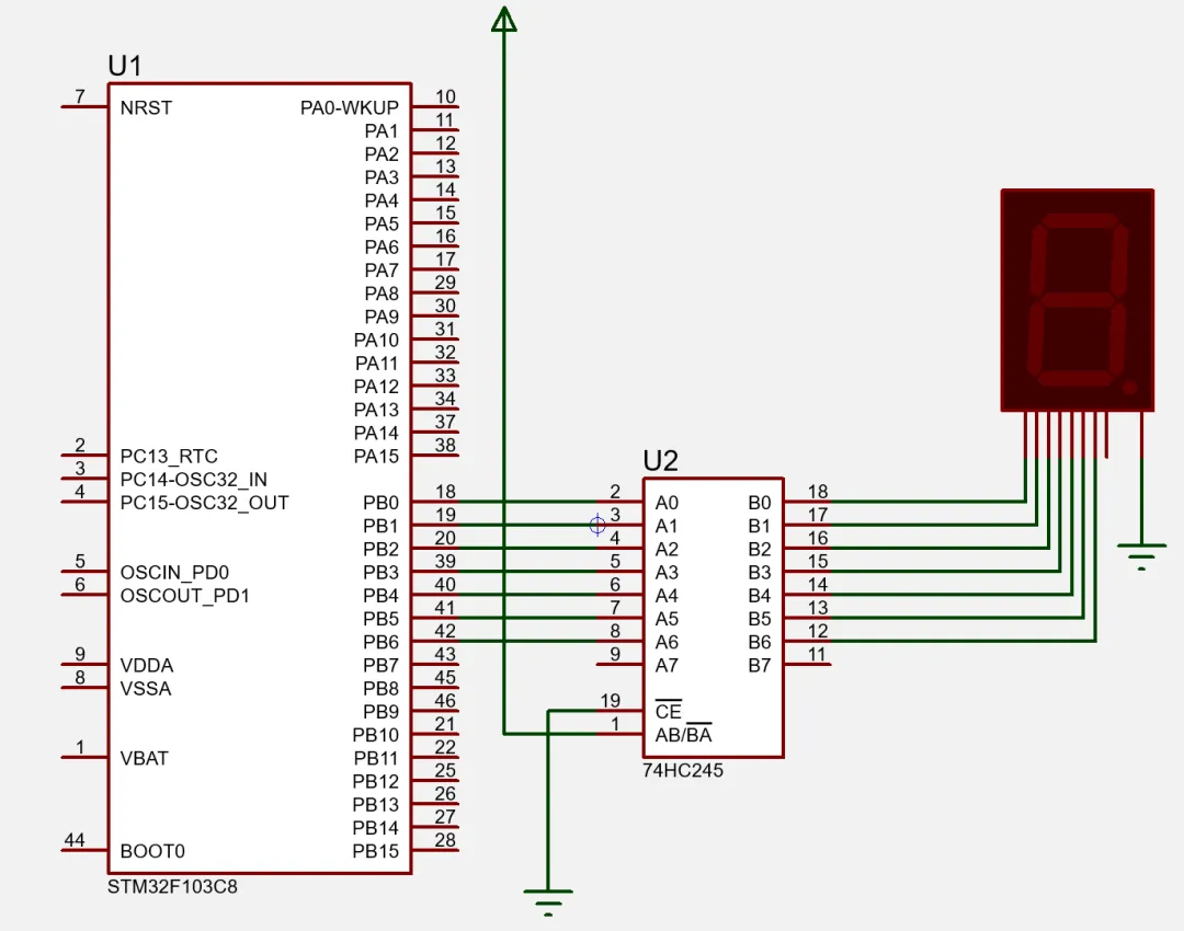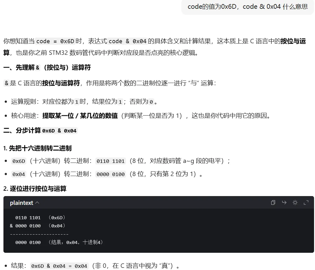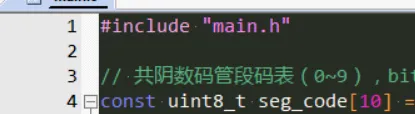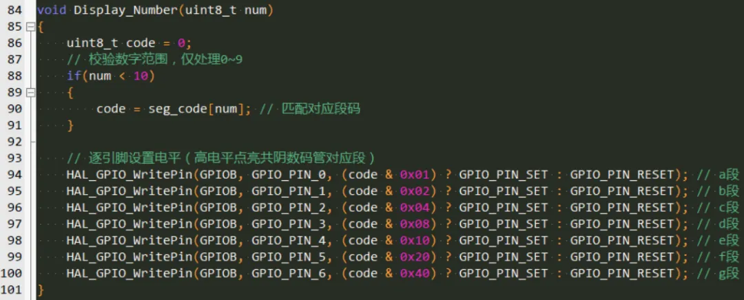 #include "main.h"// 共阴数码管段码表(0~9),bit0=a(PB0), bit1=b(PB1)...bit6=g(PB6)const uint8_t seg_code[10] = {0x3F, // 0: a,b,c,d,e,f亮0x06, // 1: b,c亮0x5B, // 2: a,b,g,e,d亮0x4F, // 3: a,b,g,c,d亮0x66, // 4: f,g,b,c亮0x6D, // 5: a,f,g,c,d亮0x7D, // 6: a,f,g,c,d,e亮0x07, // 7: a,b,c亮0x7F, // 8: 全亮0x6F // 9: a,b,c,d,f,g亮};/*** @brief 系统时钟配置:HSI 8MHz -> PLL 64MHz,HCLK=64MHz* @param 无* @retval 无*/void SystemClock_Config(void){RCC_OscInitTypeDef RCC_OscInitStruct = {0};RCC_ClkInitTypeDef RCC_ClkInitStruct = {0};// 配置HSI和PLLRCC_OscInitStruct.OscillatorType = RCC_OSCILLATORTYPE_HSI; // 使用内部HSI时钟RCC_OscInitStruct.HSIState = RCC_HSI_ON; // 开启HSIRCC_OscInitStruct.HSICalibrationValue = RCC_HSICALIBRATION_DEFAULT; // HSI默认校准值(8MHz)RCC_OscInitStruct.PLL.PLLState = RCC_PLL_ON; // 开启PLLRCC_OscInitStruct.PLL.PLLSource = RCC_PLLSOURCE_HSI_DIV2; // HSI分频2(8MHz/2=4MHz)作为PLL输入RCC_OscInitStruct.PLL.PLLMUL = RCC_PLL_MUL16; // PLL倍频16(4MHz×16=64MHz)if (HAL_RCC_OscConfig(&RCC_OscInitStruct) != HAL_OK){Error_Handler();}// 配置系统时钟源和总线分频RCC_ClkInitStruct.ClockType = RCC_CLOCKTYPE_HCLK|RCC_CLOCKTYPE_SYSCLK|RCC_CLOCKTYPE_PCLK1|RCC_CLOCKTYPE_PCLK2;RCC_ClkInitStruct.SYSCLKSource = RCC_SYSCLKSOURCE_PLLCLK; // 系统时钟=PLL(64MHz)RCC_ClkInitStruct.AHBCLKDivider = RCC_SYSCLK_DIV1; // AHB分频1 → HCLK=64MHzRCC_ClkInitStruct.APB1CLKDivider = RCC_HCLK_DIV2; // APB1分频2 → PCLK1=32MHzRCC_ClkInitStruct.APB2CLKDivider = RCC_HCLK_DIV1; // APB2分频1 → PCLK2=64MHz// 配置FLASH延迟(64MHz需要2个等待周期)if (HAL_RCC_ClockConfig(&RCC_ClkInitStruct, FLASH_LATENCY_2) != HAL_OK){Error_Handler();}}/*** @brief 初始化PB0~PB6为推挽输出模式* @param 无* @retval 无*/void GPIO_Init_Display(void){GPIO_InitTypeDef GPIO_InitStruct = {0};// 使能GPIOB时钟(APB2总线,时钟64MHz)__HAL_RCC_GPIOB_CLK_ENABLE();// 配置PB0~PB6为推挽输出,速度50MHzGPIO_InitStruct.Pin = GPIO_PIN_0 | GPIO_PIN_1 | GPIO_PIN_2 |GPIO_PIN_3 | GPIO_PIN_4 | GPIO_PIN_5 | GPIO_PIN_6;GPIO_InitStruct.Mode = GPIO_MODE_OUTPUT_PP; // 推挽输出GPIO_InitStruct.Pull = GPIO_NOPULL; // 无上拉下拉GPIO_InitStruct.Speed = GPIO_SPEED_FREQ_HIGH;// 高速输出HAL_GPIO_Init(GPIOB, &GPIO_InitStruct);// 初始低电平,数码管熄灭HAL_GPIO_WritePin(GPIOB, GPIO_PIN_0|GPIO_PIN_1|GPIO_PIN_2|GPIO_PIN_3|GPIO_PIN_4|GPIO_PIN_5|GPIO_PIN_6, GPIO_PIN_RESET);}/*** @brief 显示指定数字(0~9),参数为要显示的数字* @param num: 0~9(超出范围则熄灭数码管)* @retval 无*/void Display_Number(uint8_t num){uint8_t code = 0;// 校验数字范围,仅处理0~9if(num < 10){code = seg_code[num]; // 匹配对应段码}// 逐引脚设置电平(高电平点亮共阴数码管对应段)HAL_GPIO_WritePin(GPIOB, GPIO_PIN_0, (code & 0x01) ? GPIO_PIN_SET : GPIO_PIN_RESET); // a段HAL_GPIO_WritePin(GPIOB, GPIO_PIN_1, (code & 0x02) ? GPIO_PIN_SET : GPIO_PIN_RESET); // b段HAL_GPIO_WritePin(GPIOB, GPIO_PIN_2, (code & 0x04) ? GPIO_PIN_SET : GPIO_PIN_RESET); // c段HAL_GPIO_WritePin(GPIOB, GPIO_PIN_3, (code & 0x08) ? GPIO_PIN_SET : GPIO_PIN_RESET); // d段HAL_GPIO_WritePin(GPIOB, GPIO_PIN_4, (code & 0x10) ? GPIO_PIN_SET : GPIO_PIN_RESET); // e段HAL_GPIO_WritePin(GPIOB, GPIO_PIN_5, (code & 0x20) ? GPIO_PIN_SET : GPIO_PIN_RESET); // f段HAL_GPIO_WritePin(GPIOB, GPIO_PIN_6, (code & 0x40) ? GPIO_PIN_SET : GPIO_PIN_RESET); // g段}/*** @brief 错误处理函数(死循环)* @param 无* @retval 无*/void Error_Handler(void){while(1){// 时钟配置失败时可添加LED闪烁等提示}}/*** @brief 主函数:循环显示0~9,间隔1秒* @param 无* @retval 无*/int main(void){// 1. HAL库初始化(初始化SysTick,用于HAL_Delay)HAL_Init();// 2. 配置系统时钟为HSI→64MHzSystemClock_Config();// 3. 初始化数码管GPIOGPIO_Init_Display();uint8_t disp_num = 0; // 显示数字变量while(1){Display_Number(disp_num); // 显示当前数字HAL_Delay(1000); // 延时1秒(基于SysTick,时钟64MHz下准确)disp_num = (disp_num + 1) % 10; // 数字循环0~9}}#ifdef USE_FULL_ASSERTvoid assert_failed(uint8_t *file, uint32_t line){// 断言失败处理(可选)}#endif