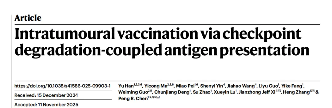 [1]Han Y, Ma Y, Pei M, Yin S, Wang J, Guo L, Fang Y, Guo W, Deng C, Zhao S, Lu X, Xi JJ, Zhang H, Chen PR. Intratumoural vaccination via checkpoint degradation-coupled antigen presentation. Nature. 2026 Jan 7. doi: 10.1038/s41586-025-09903-1. Epub ahead of print. PMID: 41501465.