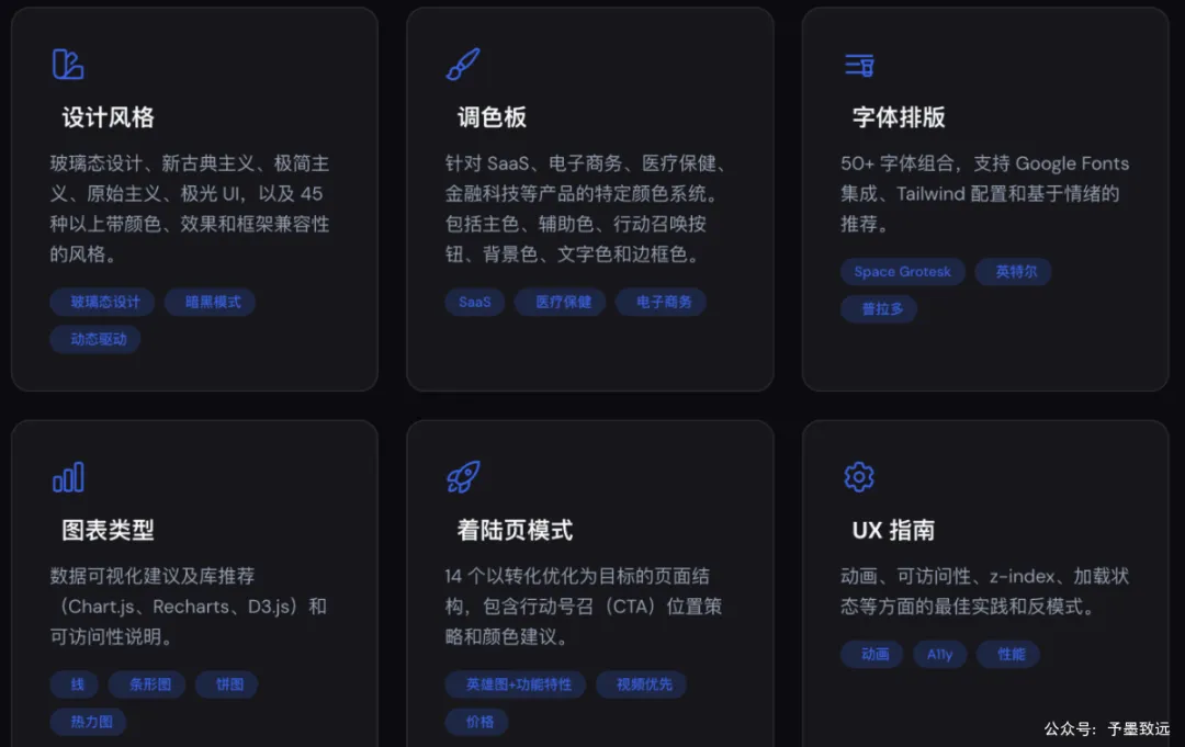 全面的UX指南:集成98条UX最佳实践、反模式警示和无障碍(WCAG)设计规则,确保生成的界面不仅好看,更好用。