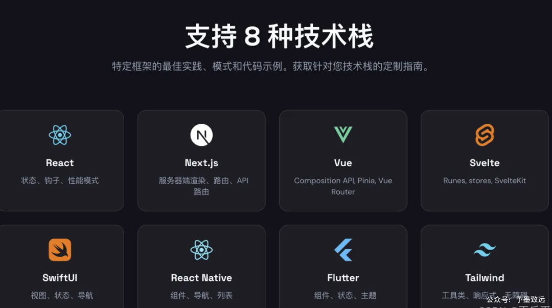 多技术栈支持:覆盖React、Next.js、Vue、Svelte、SwiftUI、Flutter等10个主流前端与移动端技术栈,能根据项目需求自动切换实现建议。