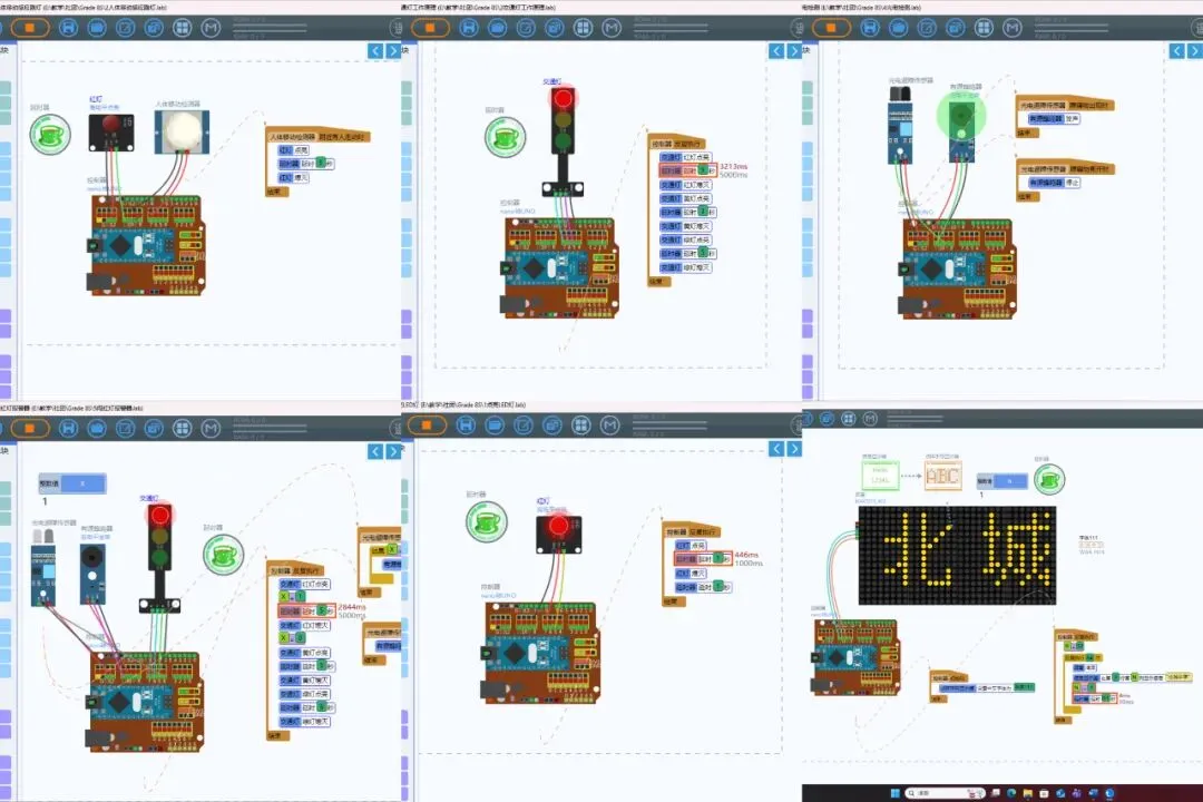 社团以Linkboy图形化编程软件为起点,设计了12个循序渐进的趣味任务。同学们从最基础的“点亮LED灯”开始,一步步探索“人体移动感应路灯”“交通灯工作原理”“超声波测距报警”等贴近生活的应用场景。
