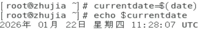 $(date)和 `date` 会执行替换命令,将其赋值给currentdate变量,并通过echo输出显示。