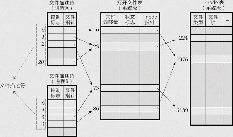在内核中,文件描述符的管理依赖于三层紧密关联的数据结构,这三层结构分别是进程文件描述符表、系统打开文件表和 vnode/inode 表 。
