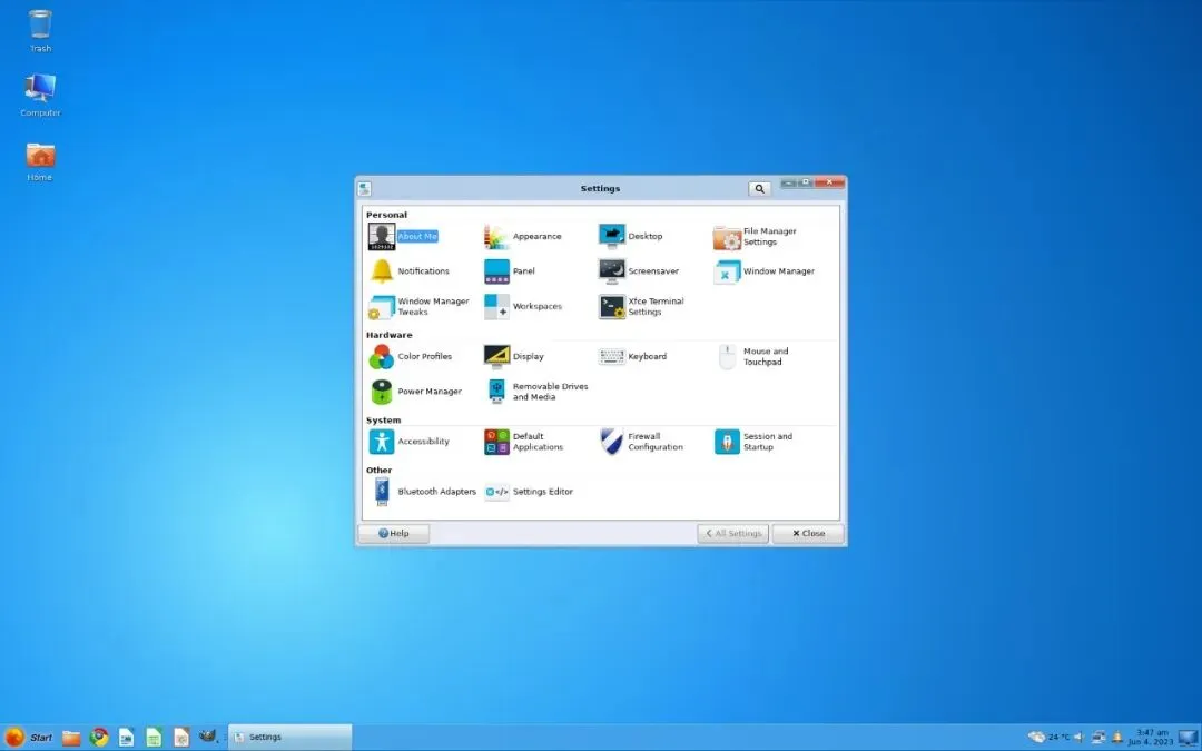- • 🖥️ 桌面环境:采用 Xfce 4.18,配合 Whisker 菜单 与定制主题,整体风格高度贴近 Windows 7。
