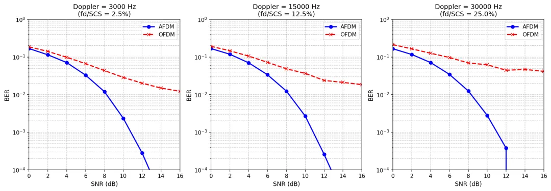 💡 全分集优势:随着信噪比提升,AFDM 的误码率曲线斜率显著大于 OFDM,无误码平层现象。