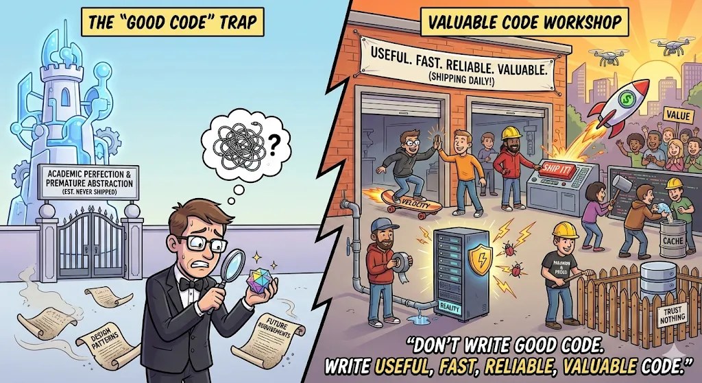 “好代码”往往是一个陷阱。它是一个充满抽象模式、过早抽象和追求美学完美的学术定义,而这些往往在生产环境的第一次接触中就无法生存(经不起实战考验)。