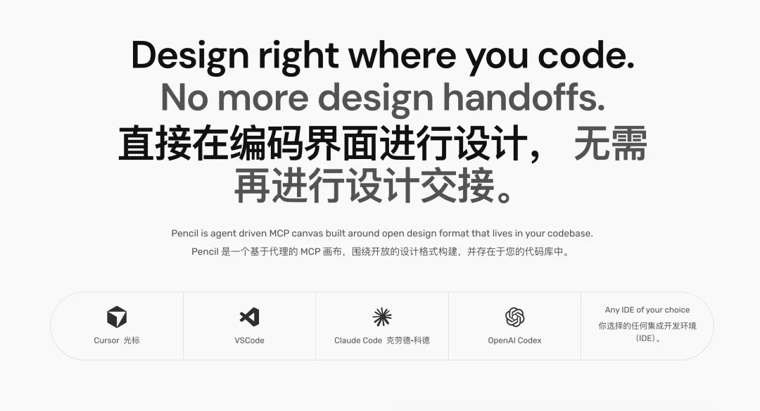 Pencil 是个 AI 设计工具,但它不是又一个 Figma。它的定位很明确:把设计画布直接塞进 IDE 里,让设计文件和代码放在同一个 Git 仓库。