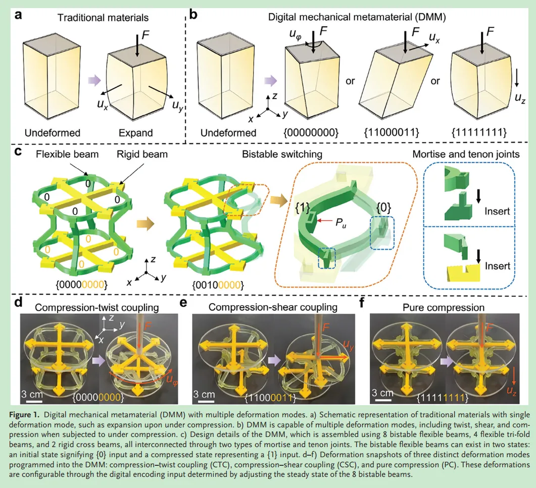 通过编程8根双稳态梁的数字状态(0或1),单个DMM单元在压缩下可展现出三种截然不同的变形响应: