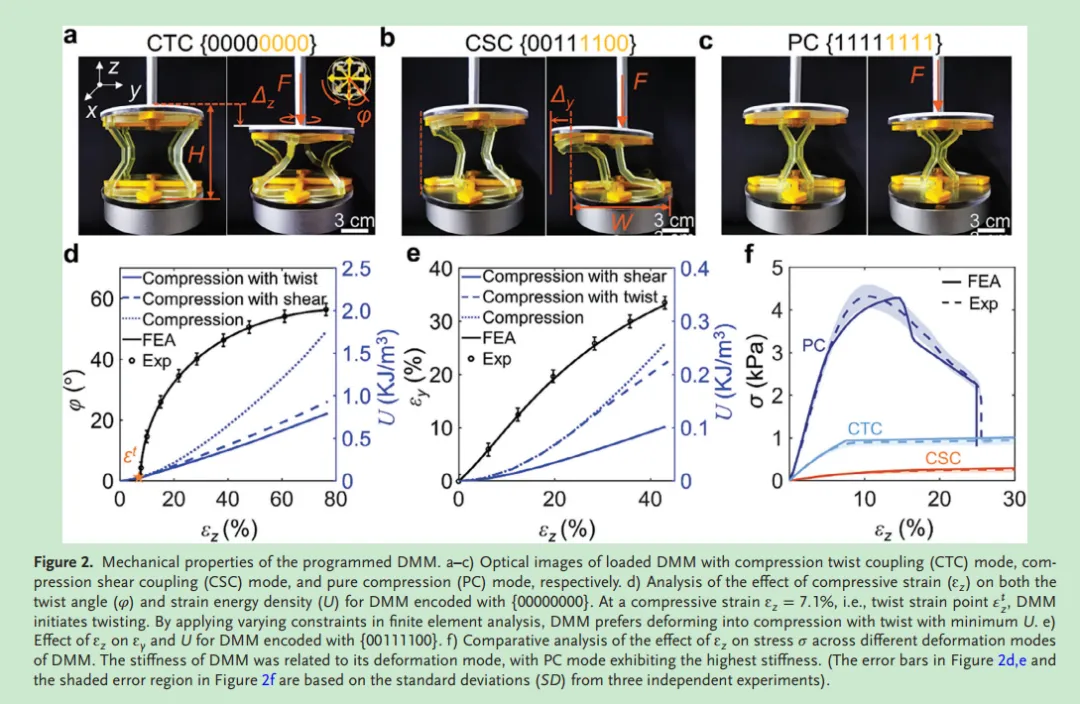 实验与模拟验证:结合压缩实验和有限元分析,证实了各模式的变形轨迹、刚度差异及应变能最小化原理。