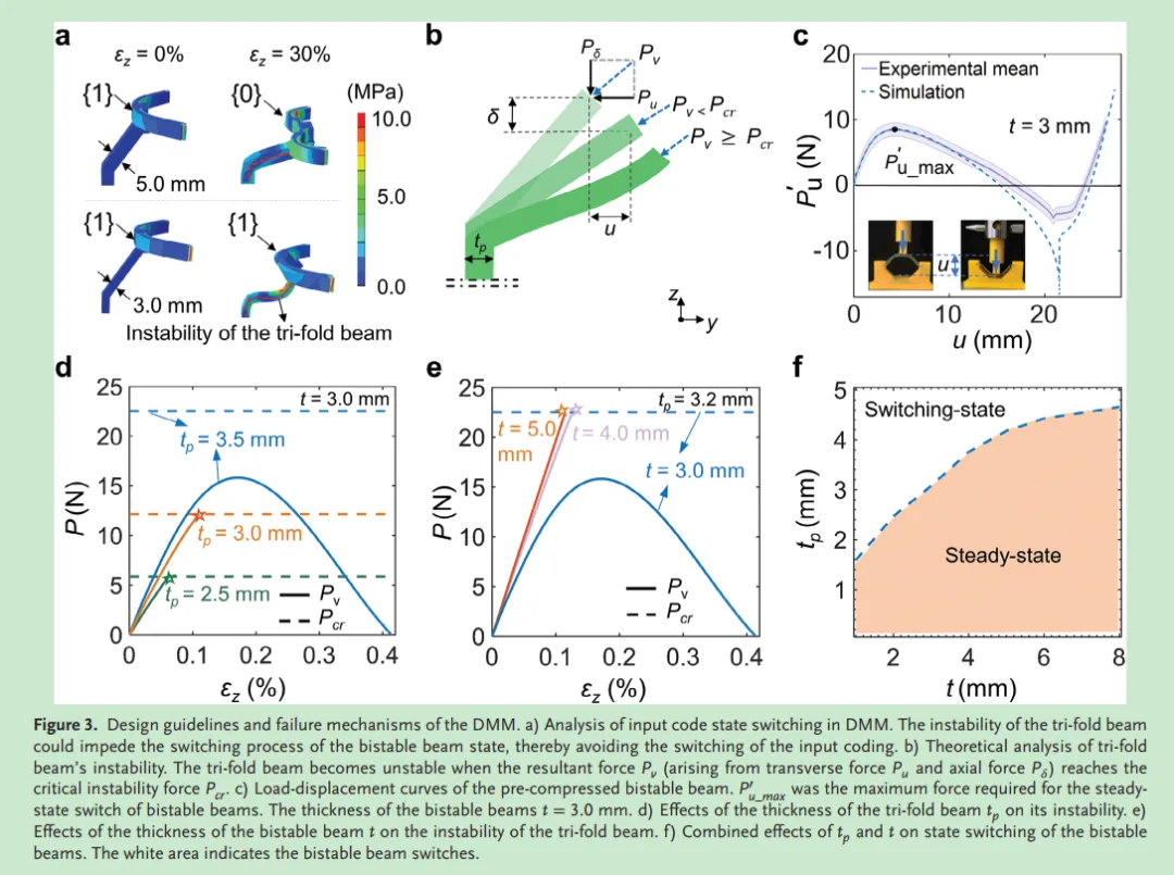 设计规则:通过理论模型与实验,明确了三折梁厚度(t_p) 和双稳态梁厚度(t) 的匹配关系。减薄三折梁可促使其先失稳,从而“锁死”双稳态梁的状态,确保编程模式在加载过程中的稳定性(图3)。