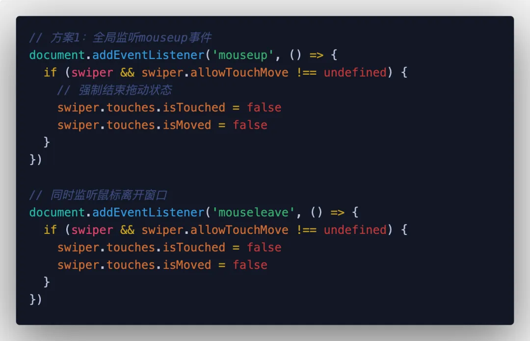 我们的项目是一个在App内运行的H5活动页面,其中使用了Swiper实现双层嵌套的轮播图。在测试过程中,我们发现了这样一个怪异的现象:Bug现象:在PC端App中,用户长按鼠标左键拖动轮播图至屏幕边缘后松开鼠标,轮播图仍然会“幽灵般”地跟随光标移动,仿佛从未释放拖拽状态。这其实不算一个大问题,只有在一种比较极端的操作下才会触发这个问题,而且即使发生问题,点击鼠标即可解除问题。最后, PC 端的用户比较少。但我们还是要尽量解决问题。第一轮尝试:常规思路与AI助手