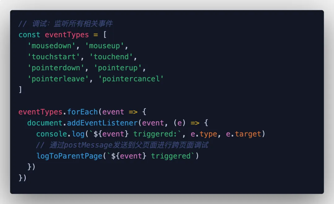 为了搞清楚到底发生了什么,我添加了全面的调试代码:这里有一个重要的技术细节:由于我们的H5页面是通过iframe嵌入到App中的,子页面的console.log在App中无法直接查看。因此我使用`postMessage`将日志发送到父页面进行显示。重要发现:指针事件的世界
