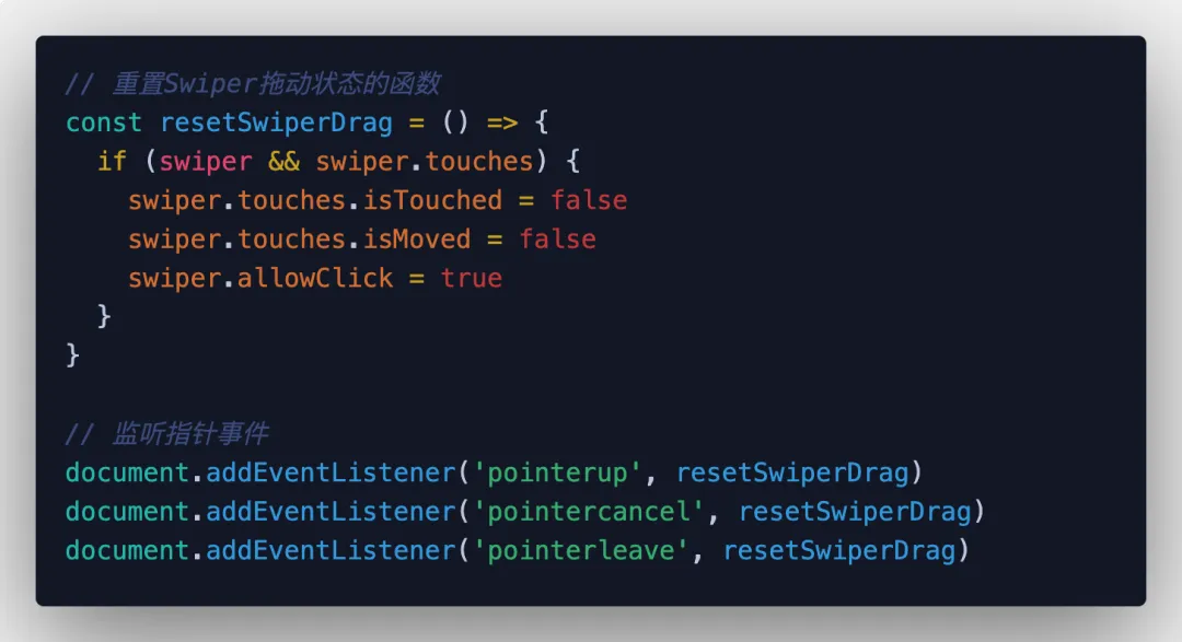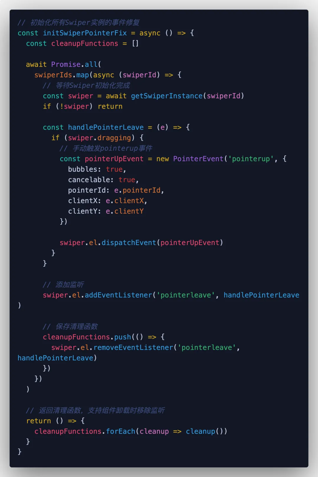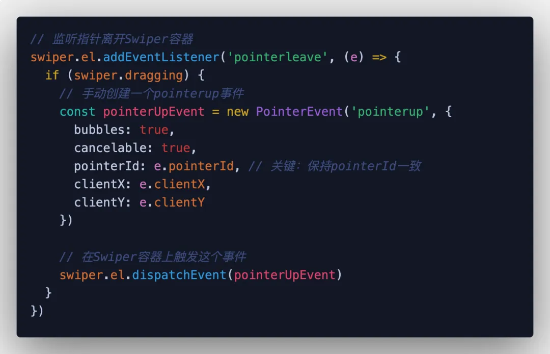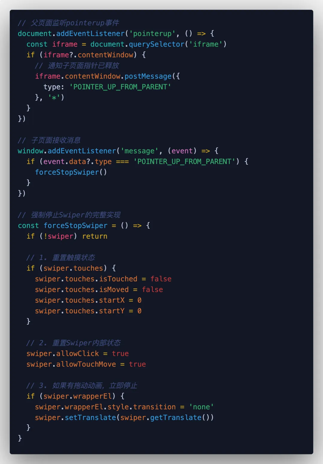 通信方案虽然逻辑合理,但实践中发现Swiper内部状态复杂,单纯重置属性并不足以完全解除拖拽状态。这时,另一个思路出现了:手动触发缺失的事件。这里有一个**关键细节**:最初实现时,我漏写了事件对象`e`,导致创建的PointerEvent没有正确的`pointerId`。由于跨页面调试困难,这个错误一度让我以为方案不可行。最终方案:健壮的事件同步