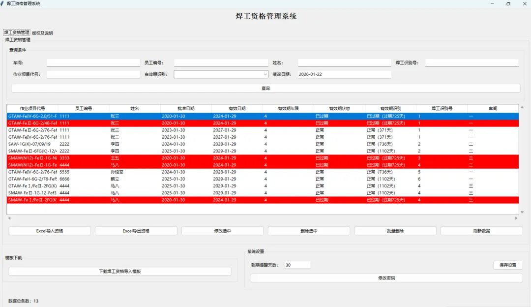 - 有效期识别:自动计算并显示焊工资格的有效期状态,红色表示已过期,黄色表示即将到期