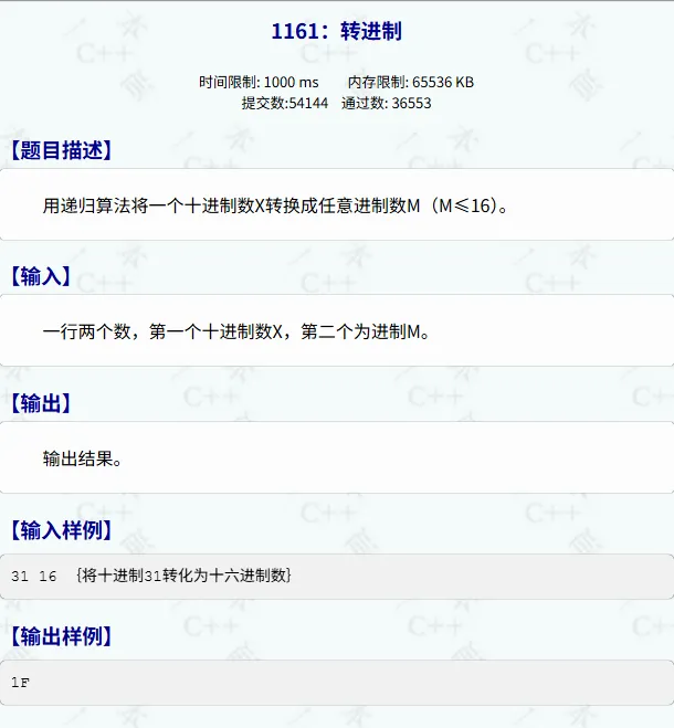#include<bits/stdc++.h>using namespace std;stringconvert(int x,int m){ if(x==0){ return "";//递归终止条件,商为0时,不再分解 } int yushu = x%m; char digit; if(yushu < 10) { digit = '0' + yushu; //余数0-9直接转字符 }else{ digit = 'A' + (yushu - 10) ;//10-15转A-F } x /= m; //更新商,用于下一层递归 string s = convert(x,m); return s + digit; } main(){ int x,m; cin >> x >> m; cout << convert(x,m); return 0; }