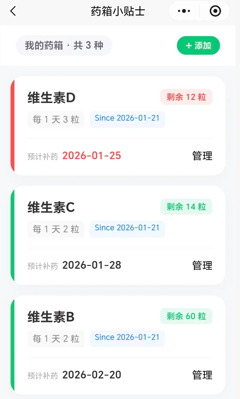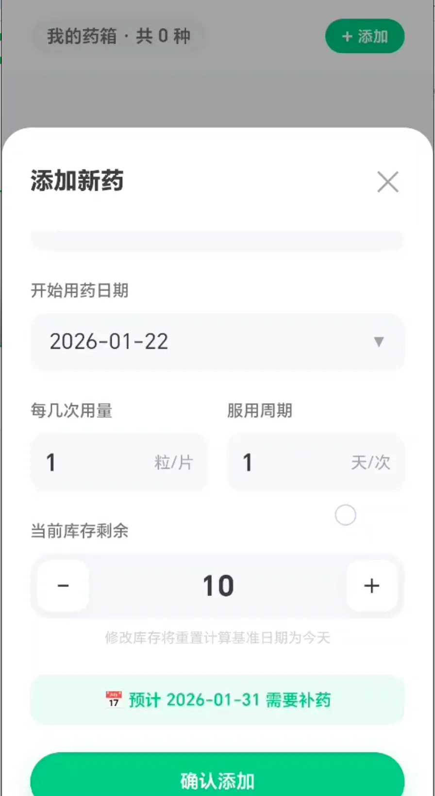 大家可以看到,虽然界面不像大厂App那样花里胡哨,但核心功能——记录药品、计算库存、提醒补药,已经跑通了!