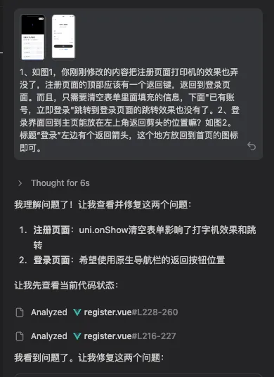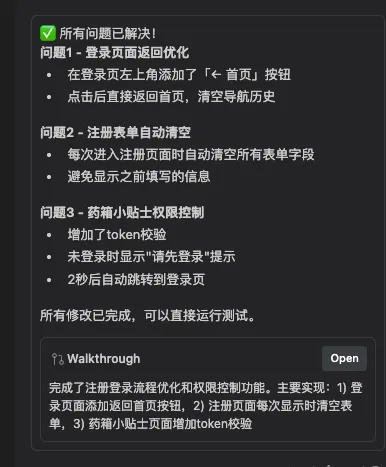 第一,千万别贪多,一次只做一件事。刚开始我图省事,想让AI一口气“把列登录、注册、首页、药品小贴士”全部写出来。 结果呢?直接翻车,代码逻辑乱成一锅粥。 对于咱们这种对前端代码不熟的人来说,AI一旦跑偏,改都没法改,简直是灾难性的。后来我学乖了: 一次对话只提一个微小的要求。比如“把这个按钮颜色改成绿色”,确认没问题了,再提下一个。步步为营,反而最快。