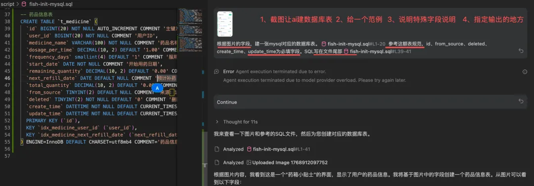 第二,不会描述?直接上图!有时候碰到报错,或者想调整布局,光用嘴说,AI经常听不懂。 这时候,截图就是最好的语言。 比如我想做数据库设计,我就截个页面的图发给它,然后找一个需要的范例:“参照这个表结构”。有参照物,AI干活顺畅多了,一次过!