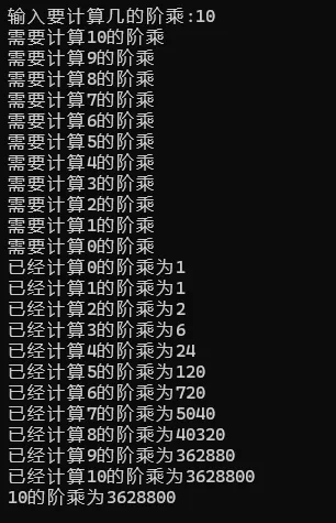 #include <stdio.h>int factorial(int n) { printf("需要计算%d的阶乘\n", n); // 终止条件 if (n == 0) { printf("已经计算%d的阶乘为%d\n", 0, 1); return 1; } // 递归计算,使用n * (n-1)! int result = n * factorial(n-1); printf("已经计算%d的阶乘为%d\n", n, result); return result;}int main() { int num; printf("输入要计算几的阶乘:"); scanf("%d", &num); // 调用函数计算 int result = factorial(num); printf("%d的阶乘为%d\n", num, result); return 0;}