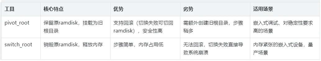 switch_root的逻辑是“直接替换根目录并销毁ramdisk”,切换后ramdisk被卸载,释放内存,但无法回滚,适用于内存紧张的嵌入式设备。