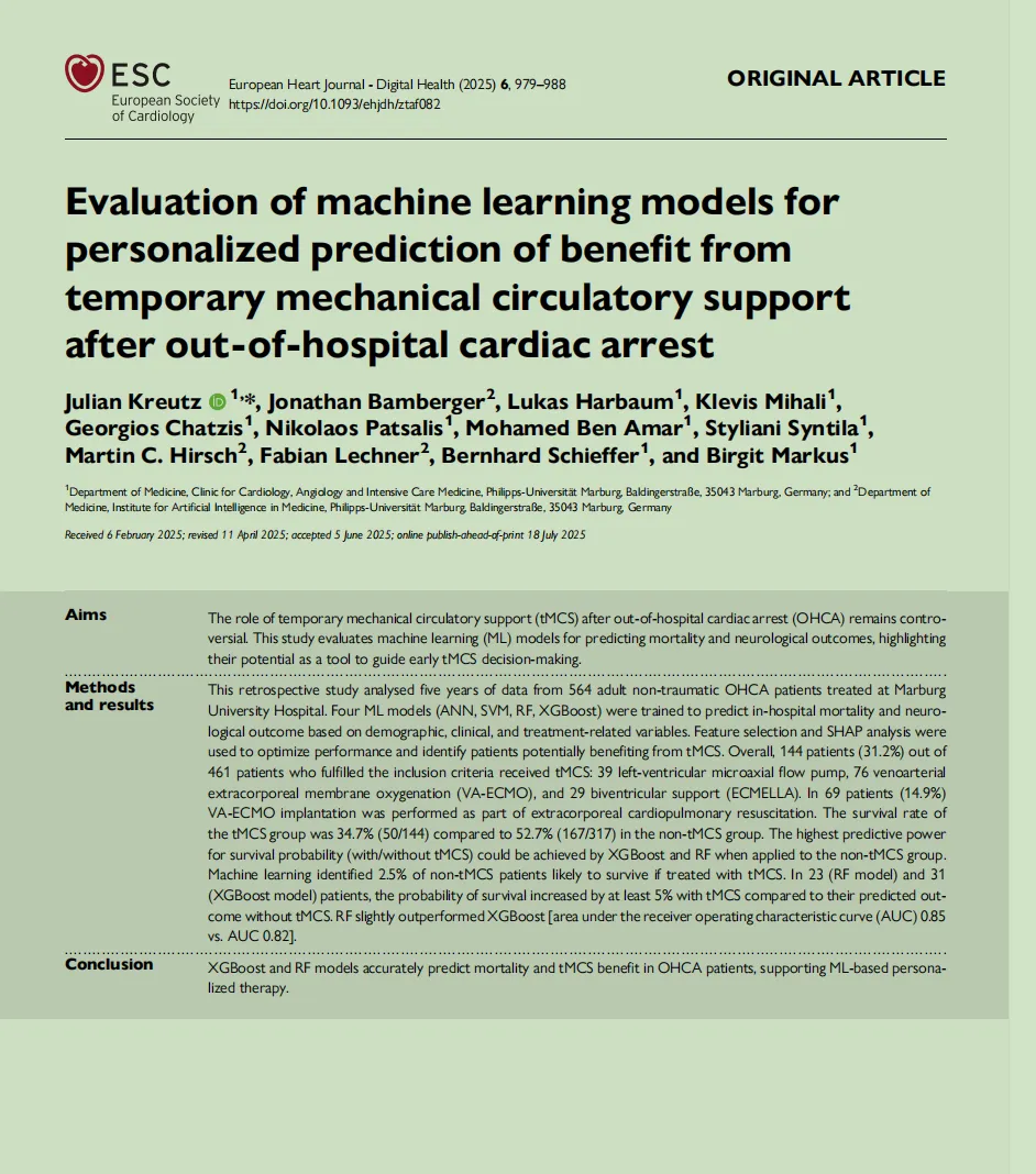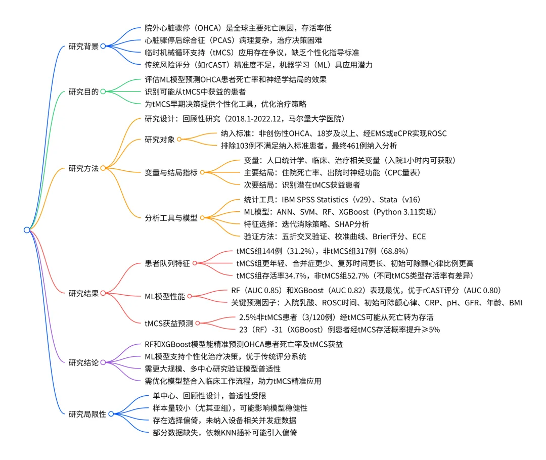 院外心脏骤停(OHCA)后临时机械循环支持(tMCS)的应用价值仍存在争议。本研究旨在评估机器学习(ML)模型对患者死亡率和神经学结局的预测效果,重点凸显其作为指导tMCS早期决策工具的潜力。