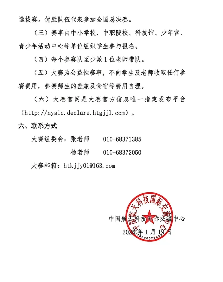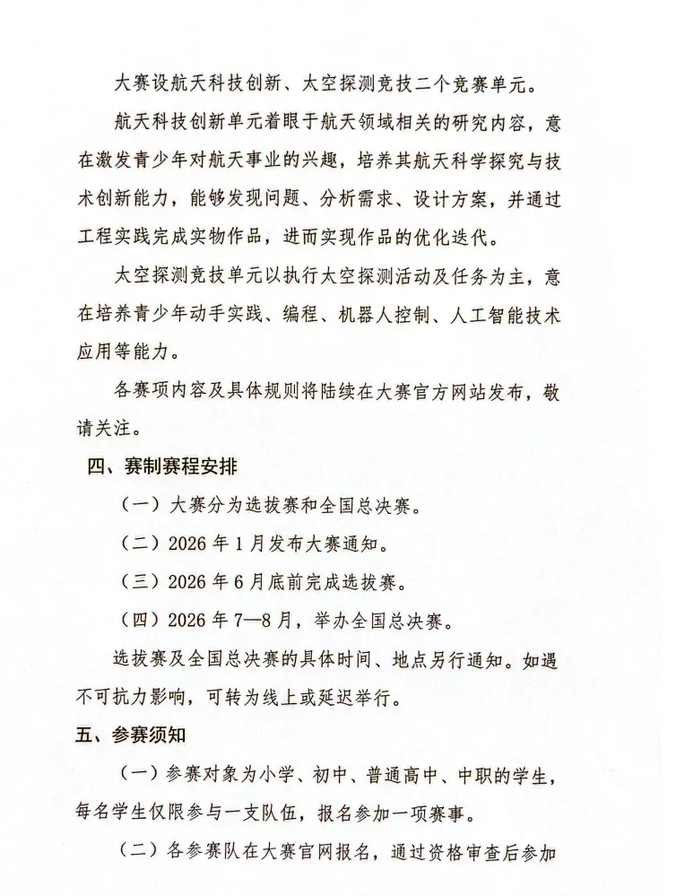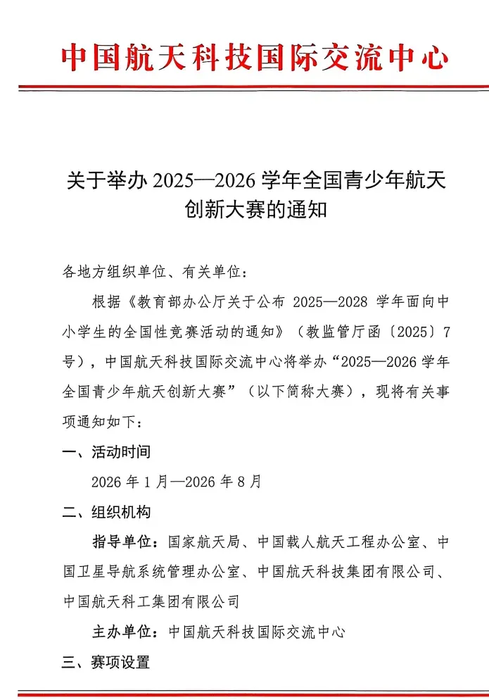 本文基于《中国航天科技国际交流中心关于举办2025—2026学年全国青少年航天创新大赛的通知》及其官网信息进行梳理和解读,旨在备赛提供参考。所有信息均以官方发布为准。