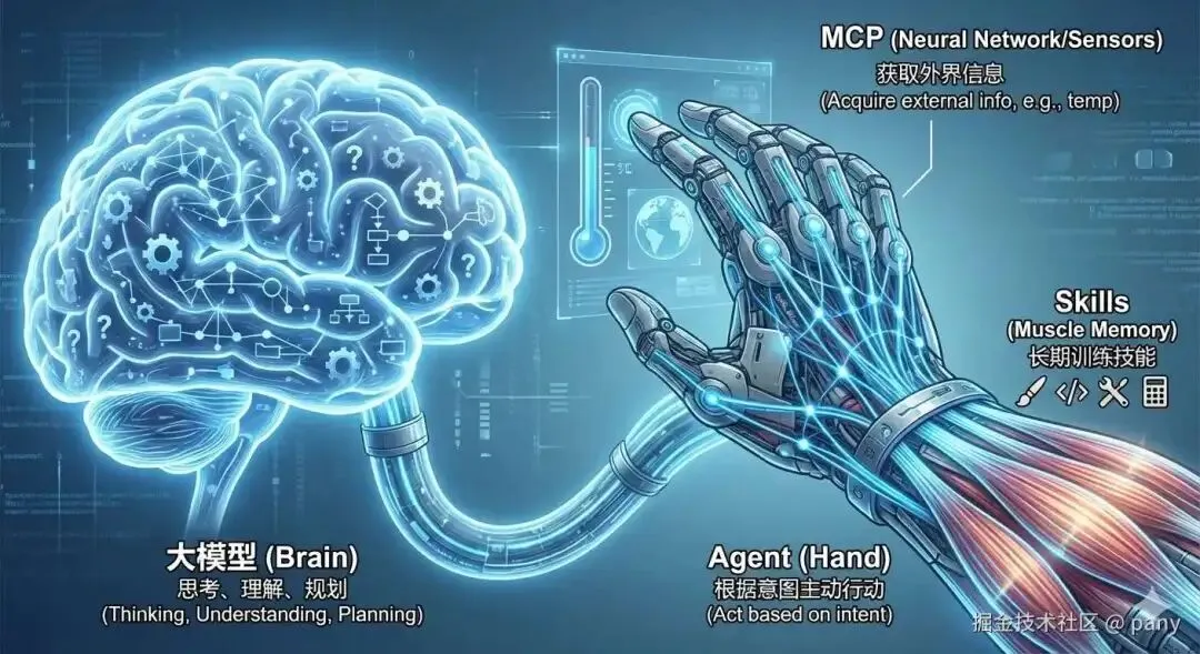 一句话解释就是:大模型类似大脑(会思考、理解、规划),Agent 是手(能根据意图主动行动),MCP 是手部的神经网络(能获取到外界信息,比如温度),Skills 是长期训练形成的手部肌肉记忆和技能。