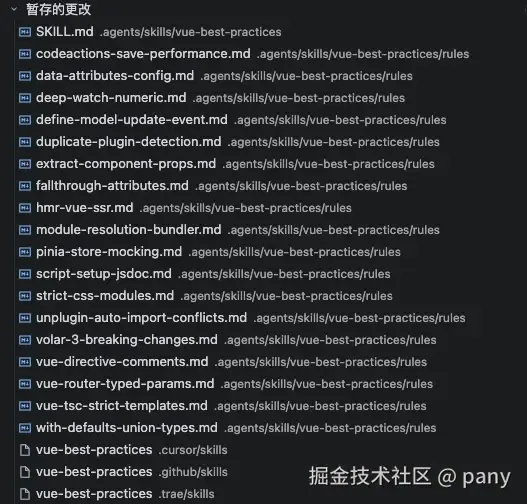 做完以后就会在你的项目中对应的目录里新增 Vue Skills 相关的配置文件了: