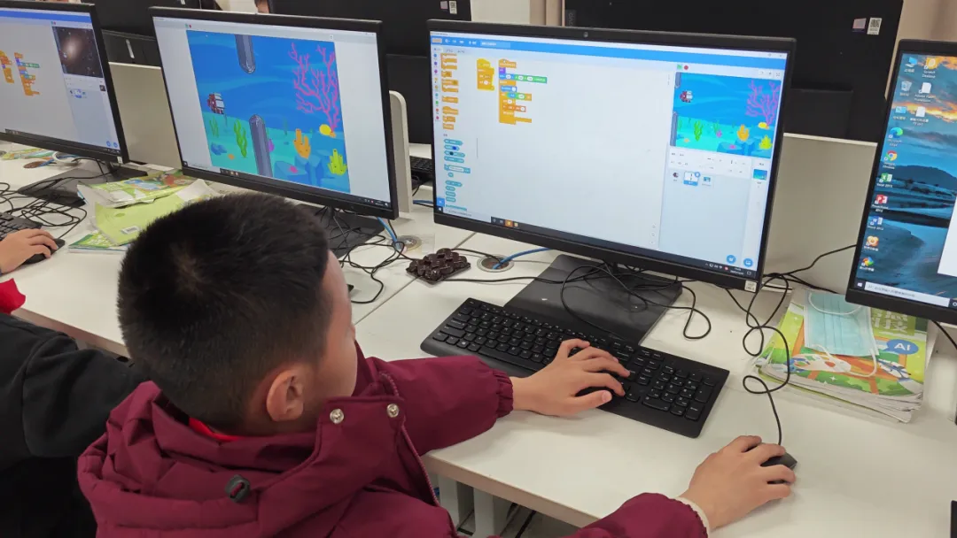 针对具象思维阶段的三年级学生,社团采用 Scratch 图形化编程工具,通过拖拽积木指令,让孩子直观感受 “指令顺序” 的力量。在课程中,孩子们已经能综合运用变量、循环知识,制作出属于自己的第一个互动游戏。