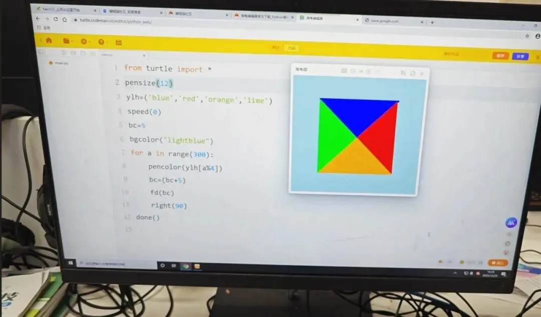 四年级学生正式接触代码式编程,从绘制一个简单的正方形开始,逐步创作出复杂的几何图案,在代码中发现数学与艺术的融合之美。社团从生活场景切入,让抽象的 Python 语言变得亲切易懂,让孩子们感受到编程的实用性与趣味性。